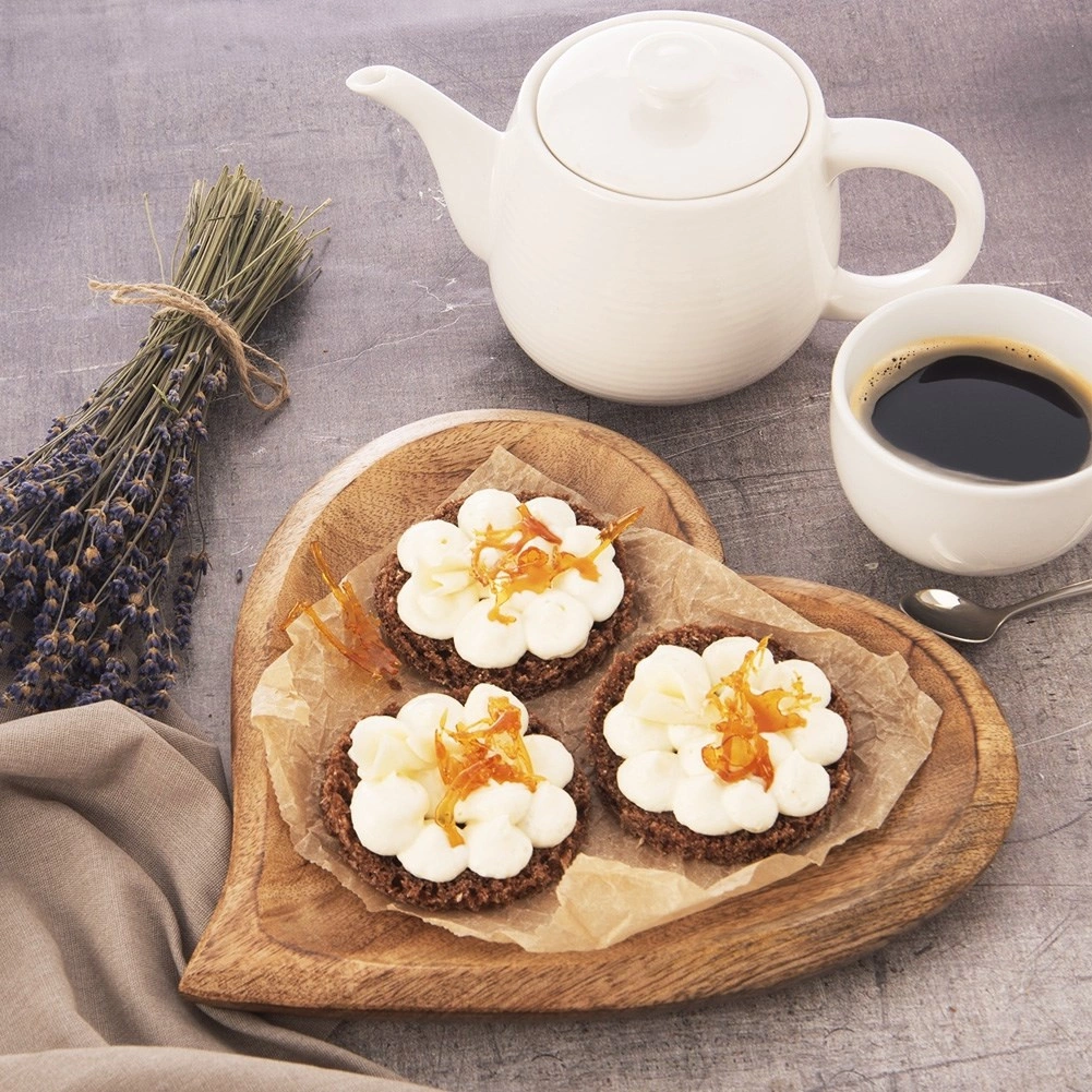 Den dekorative hjerteform løfter præsentationen af snacks, desserter og forretter og giver bordet et hyggeligt, naturligt præg.