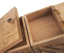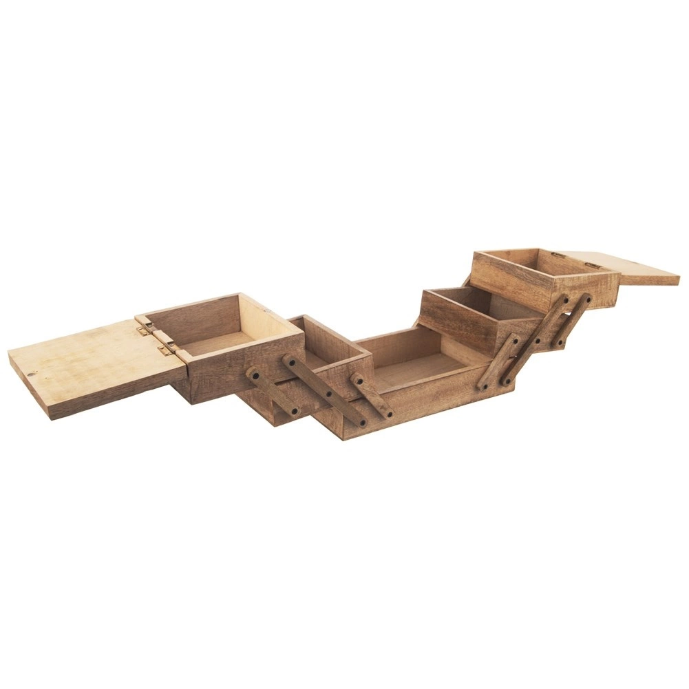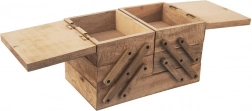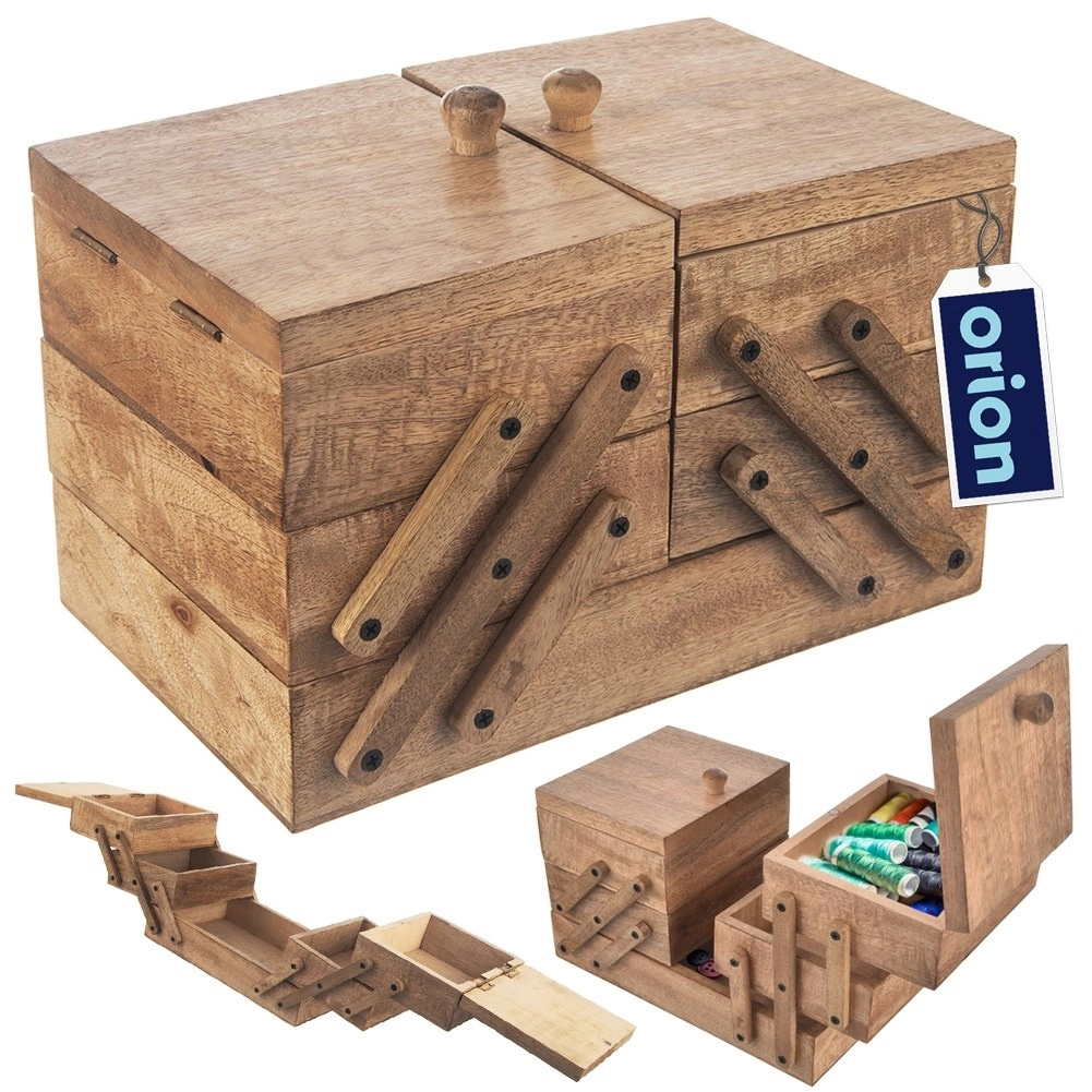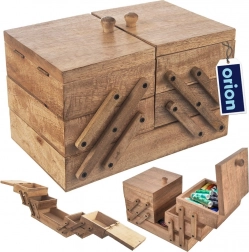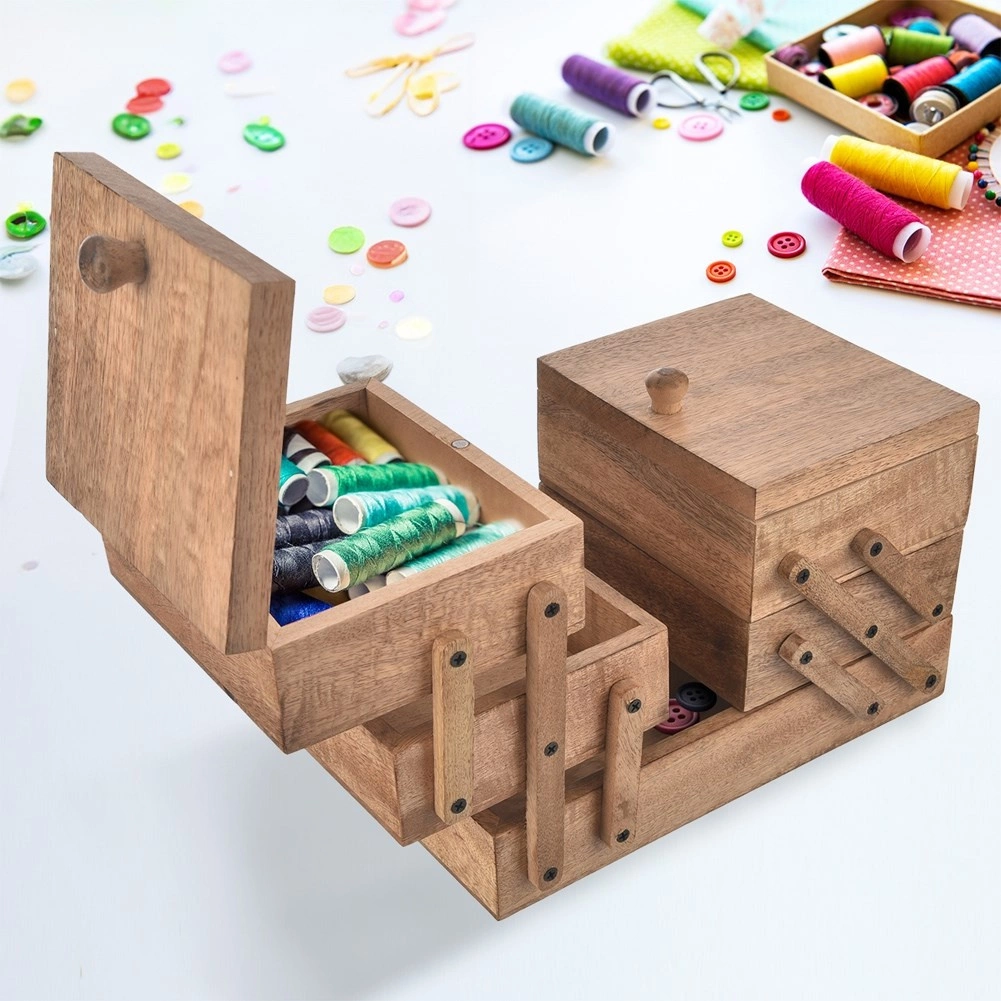 Det omhyggeligt forarbejdede træ er håndlavet, modstandsdygtigt over for fugt og deformerer ikke. To øverste låg med træknapper sikrer hurtig og komfortabel åbning. Indeni finder du 5 praktiske rum – fire kvadratiske i siderne og ét stort rektangulært i bunden – ideelt til at opdele sytilbehør, perler eller småt værktøj.