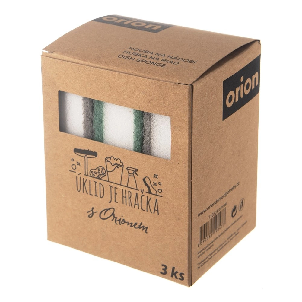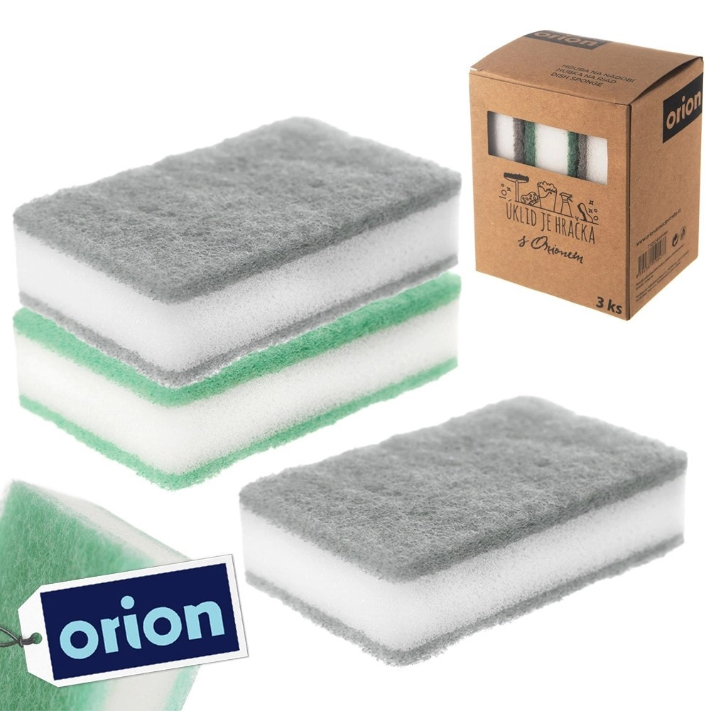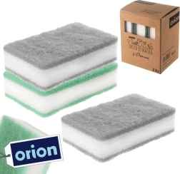 Trelags køkkensvampe kombinerer blød skum med et fast, abrasivt lag for effektiv fjernelse af snavs uden at beskadige overflader. I pakken er der to grå og én grøn svamp, velegnet til opvask og rengøring af køkkenflader.