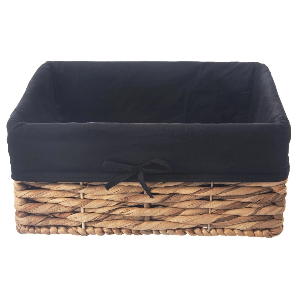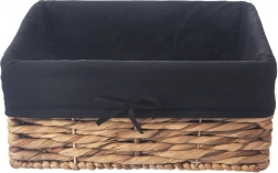 Den elegante opbevaringskurv i flettet vandhyacint har en holdbar konstruktion på en metalramme og et blødt, vaskbart for i sort med sløjfe. Takket være elastik langs kanten sidder foret perfekt og beskytter både indhold og kurv.