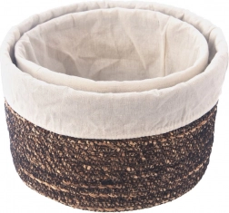 Denne håndlavede runde kurv (Ø 20 cm, højde 13 cm) af tæt flettet vandhyacint med dekorativ syning i mørk tone tilbyder en praktisk og æstetisk løsning til daglig opbevaring. Den beige tekstilindsats af bomuld og polyester tilpasser sig perfekt til kurvens form takket være elastikken og kan vaskes ved op til 30 °C.