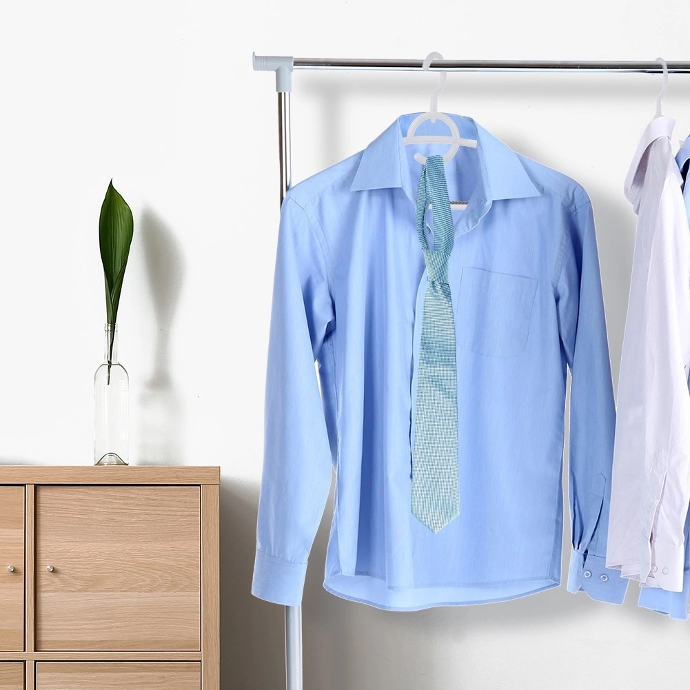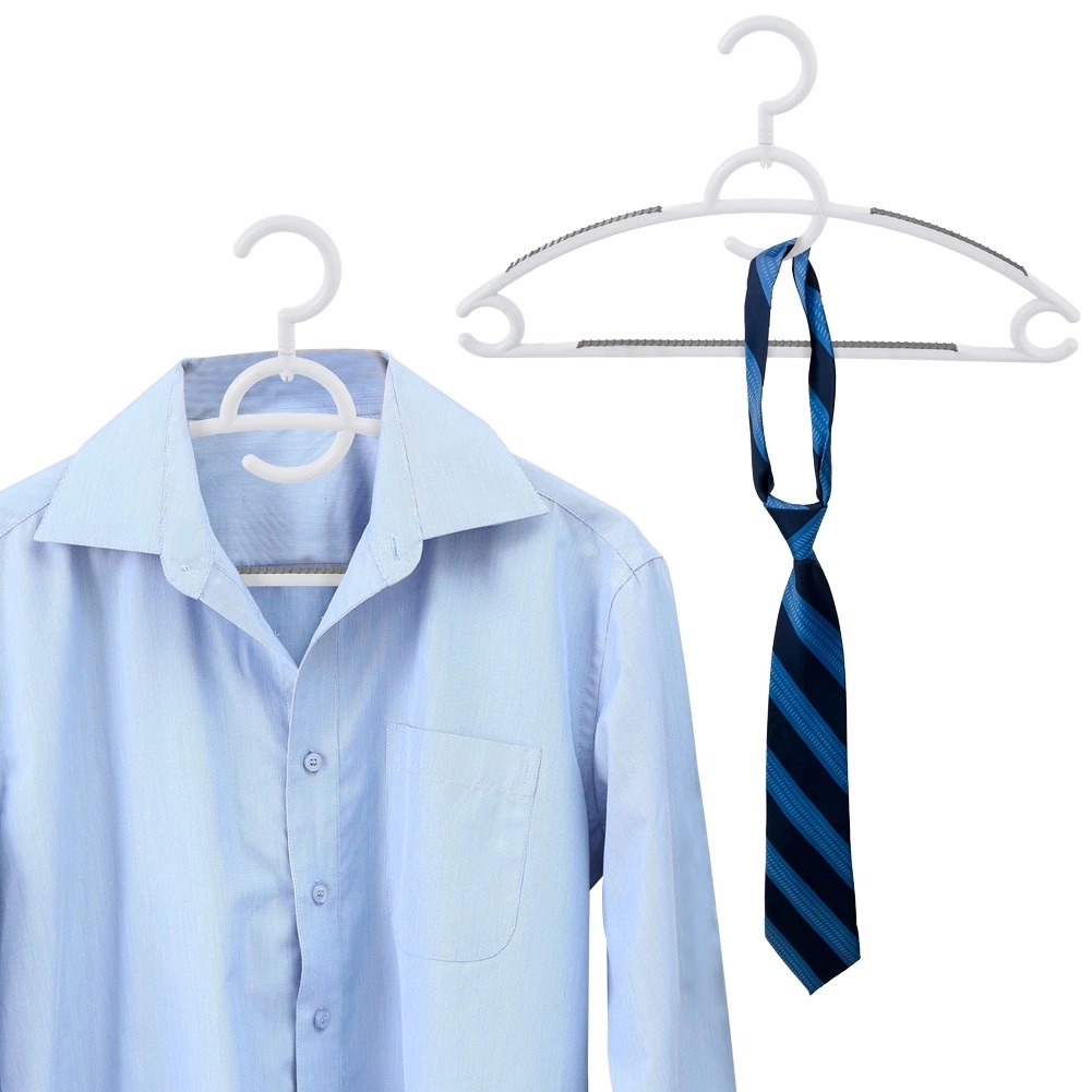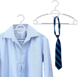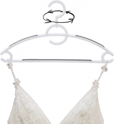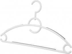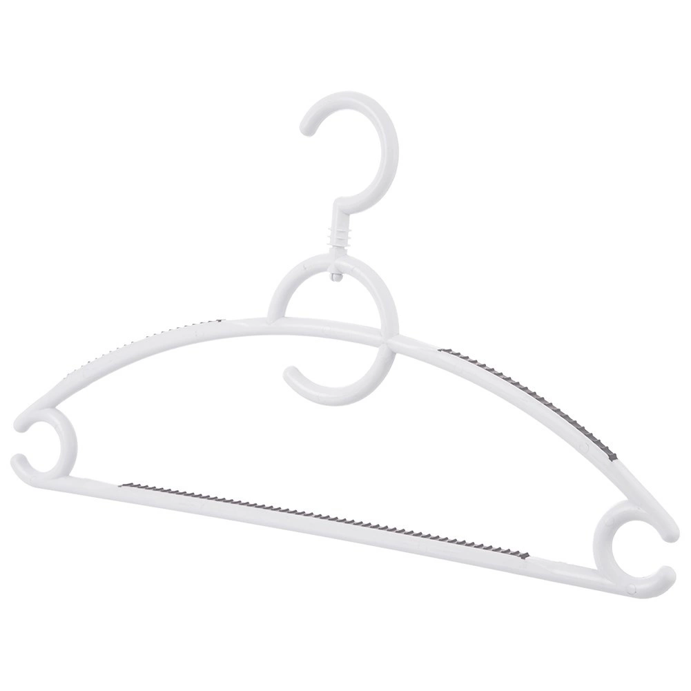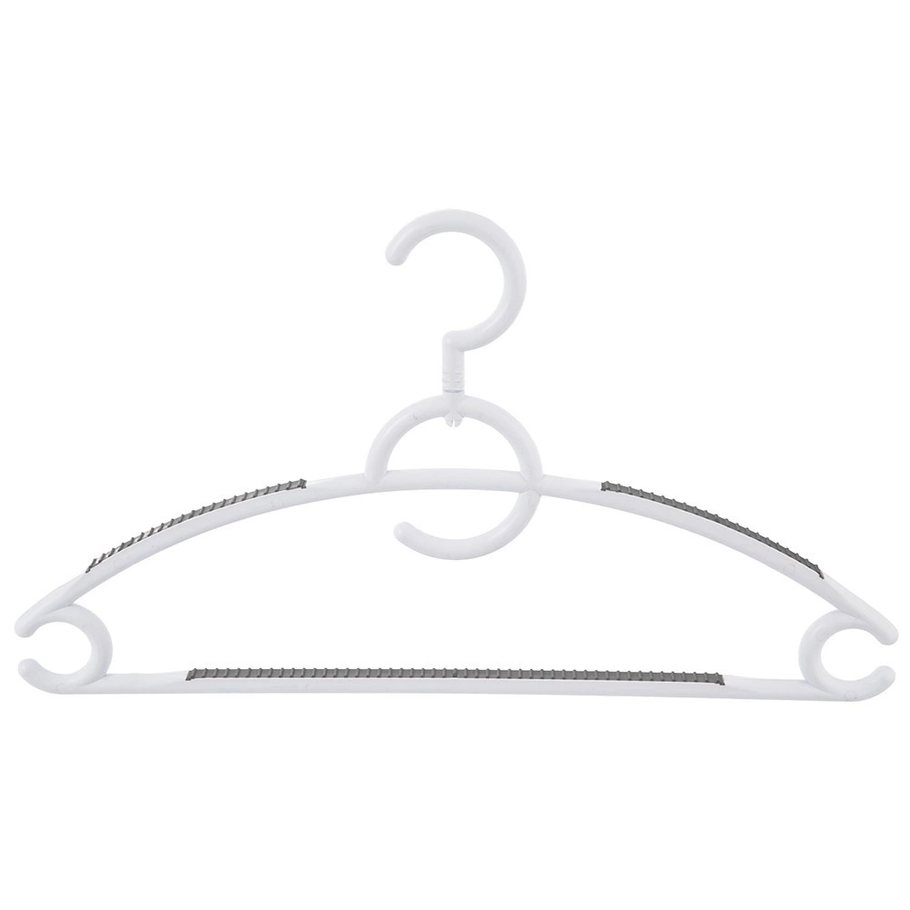 Hver bøjle har skridsikre gummibånd på skuldrene og den nederste stang, så tøjet ikke glider. Der er sidekroge til stropper på kjoler og en nederste liste til bukser eller tørklæder. Den roterbare krog gør det muligt at hænge tøjet præcis, som du har brug for – i garderobeskabet, på et stativ eller i butikken.