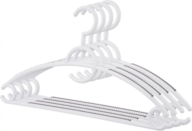 Hold garderoben overskuelig og uden krøl. Dette sæt med 4 hvide plastbøjler kombinerer holdbarhed, skridsikre flader og roterbar krog for maksimal bekvemmelighed ved ophængning og organisering. Takket være den smarte form og ekstra ophængselementer klarer de både lette toppe og frakker.