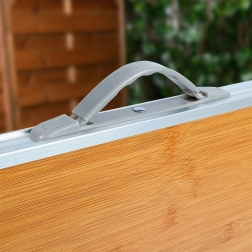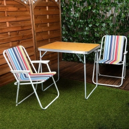 Det lette og robuste sammenklappelige bord er ideelt til have, altan, terrasse og på farten – camping, teltferie eller picnic. Bordpladen af MDF i moderne trædekor er beskyttet af en specialoverflade, aluminiumskanten og stålbenene sikrer stabilitet og lang levetid. Når det er klappet sammen, har det kompakte mål og formen som en flad kuffert med et behageligt håndtag.