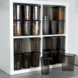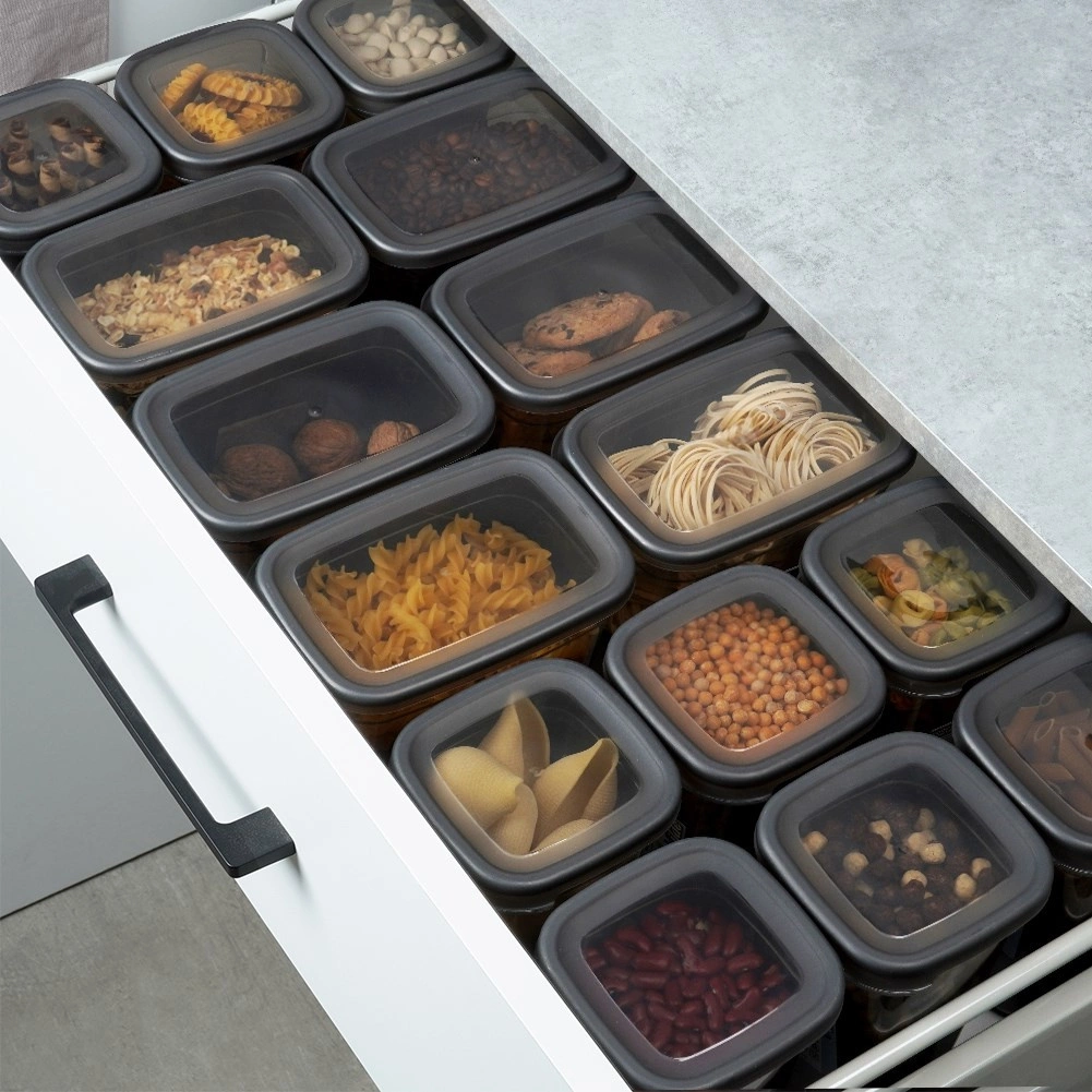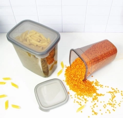 Det rektangulære profil og flade låg gør det nemt at stable flere beholdere og udnytte pladsen effektivt i spisekammer, skuffer og køleskab.