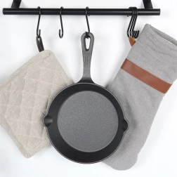 Panden er fuldt ud af støbejern, tåler høje temperaturer og er egnet til komfur, ovn samt direkte på grill eller over bål. To side-hældetud gør det lettere at hælde safter eller saucer fra, og det behagelige håndtag med hul muliggør ophængning. For lang levetid kræves enkel vedligeholdelse – skyl, tør grundigt og smør let med olie.