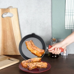 Et rødt silikoneovertræk til håndtaget medfølger for et behageligt og sikkert greb ved både madlavning og servering.