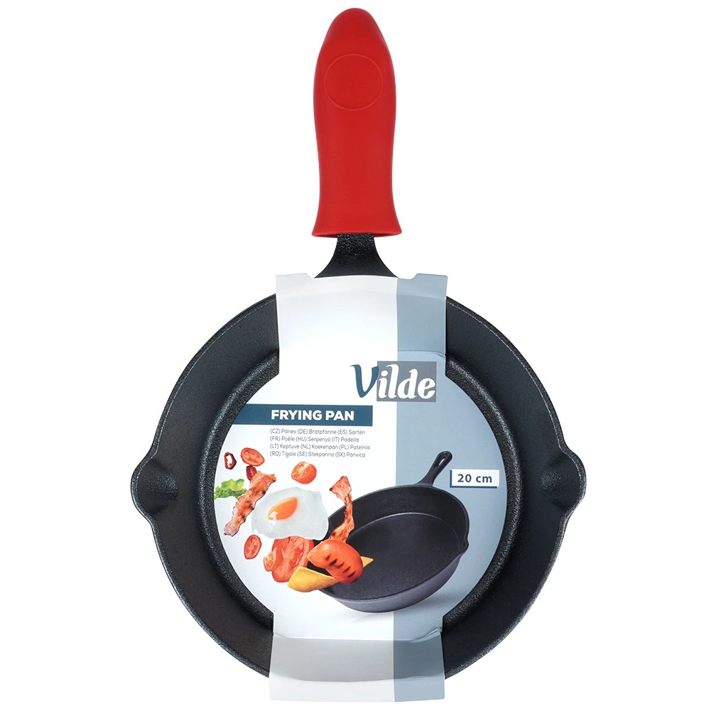 Denne kompakte støbejernspande på 20 cm er ideel til stegning, sautering, bagning og servering af tilbehør. Det massive støbejern legeme varmes hurtigt og jævnt op og holder på varmen længe, så maden forbliver varm og saftig længere. To praktiske hældetuder gør det nemt at hælde saucer eller fedt fra, og det røde silikoneovertræk øger sikkerheden ved håndtering.