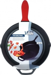 Det ergonomiske lange håndtag med hul til ophængning og hjælpegreb muliggør sikker håndtering. Et rødt silikonebetræk medfølger for et sikkert greb uden risiko for forbrænding. To praktiske udhælder gør det lettere at hælde saucer og fedt fra.