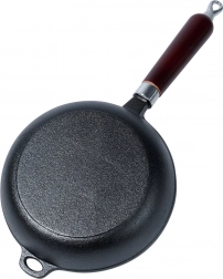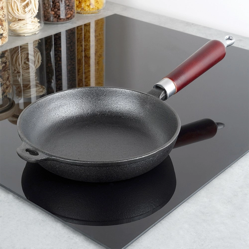 Universel støbejernspande 20 cm til stegning, bagning og simring på alle typer komfurer inkl. induktion, på grillen og direkte over åben ild. Massivt støbejern akkumulerer varme fremragende, sikrer jævn tilberedning og holder maden varm længe. Ergonomisk træhåndtag og hjælpegreb for sikker håndtering, mulighed for ophængning. Uden kemiske overfladebehandlinger, ekstremt holdbar og langtidsholdbar ved korrekt vedligeholdelse.