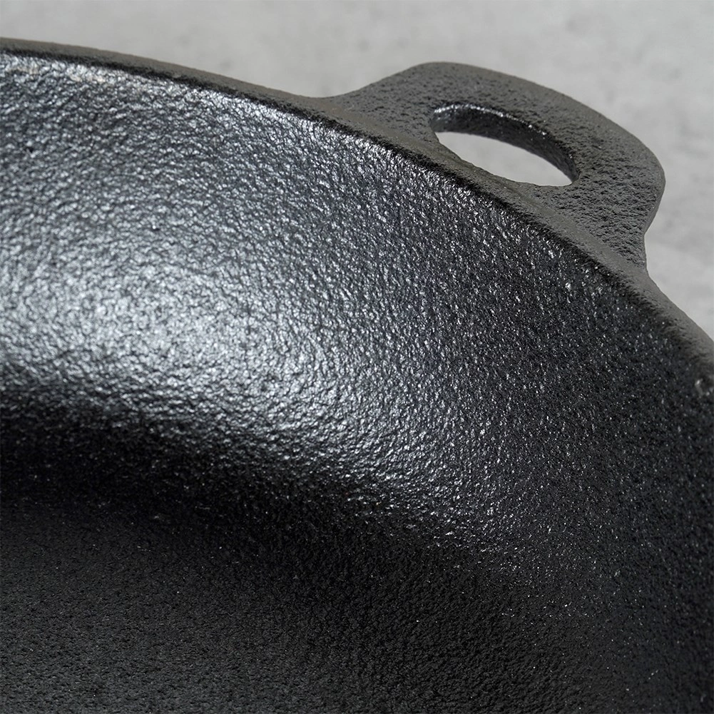 Panden er alsidig: fungerer på gas, el, glaskeramik, halogen og induktion samt på grill eller over åben ild. Den har et langt ergonomisk træhåndtag og et hjælpegreb med hul til ophængning. Konstruktionen uden nonstick-belægning er naturligt robust – det er nok at olie/season’e regelmæssigt.