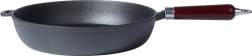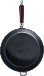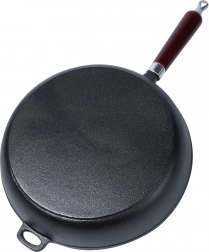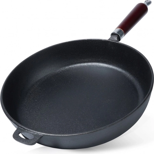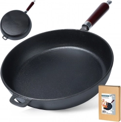 Det praktiske træhåndtag giver et sikkert greb, og hjælpegabet gør det nemt at håndtere og hænge op. Pandens kan bruges på alle typer komfurer, inklusive induktion, samt på grill eller åben ild. Efter at håndtaget er skruet af, er den også egnet til ovn. Uden nonstick-belægninger – rent støbejern for naturlige madlavningsresultater.