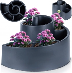 Stilfuld, kaskadeformet plantekasse i spiral med seks sektioner muliggør pladsbesparende dyrkning af blomster og urter selv på små arealer. Det robuste plastdesign af genanvendt materiale er velegnet til helårsbrug udendørs, er let at rengøre og fremhæver beplantningen smukt på altan, terrasse og i haven.