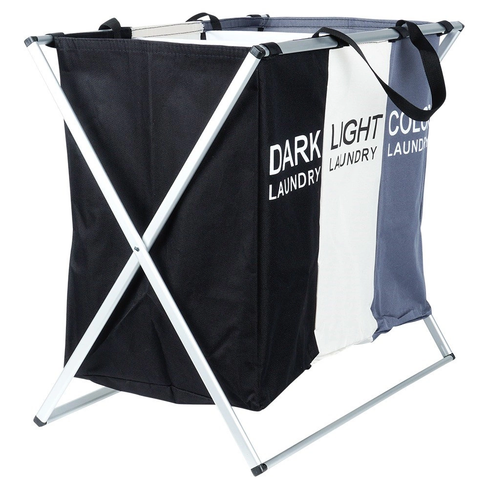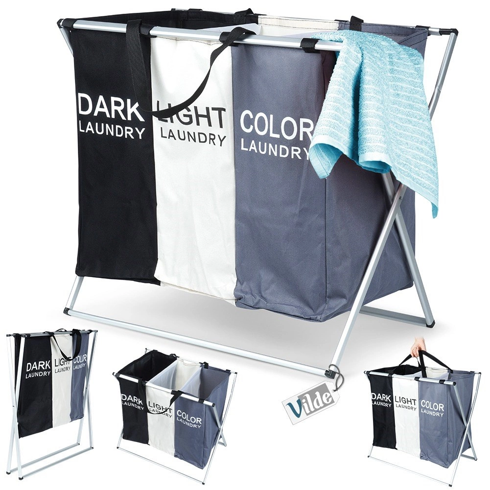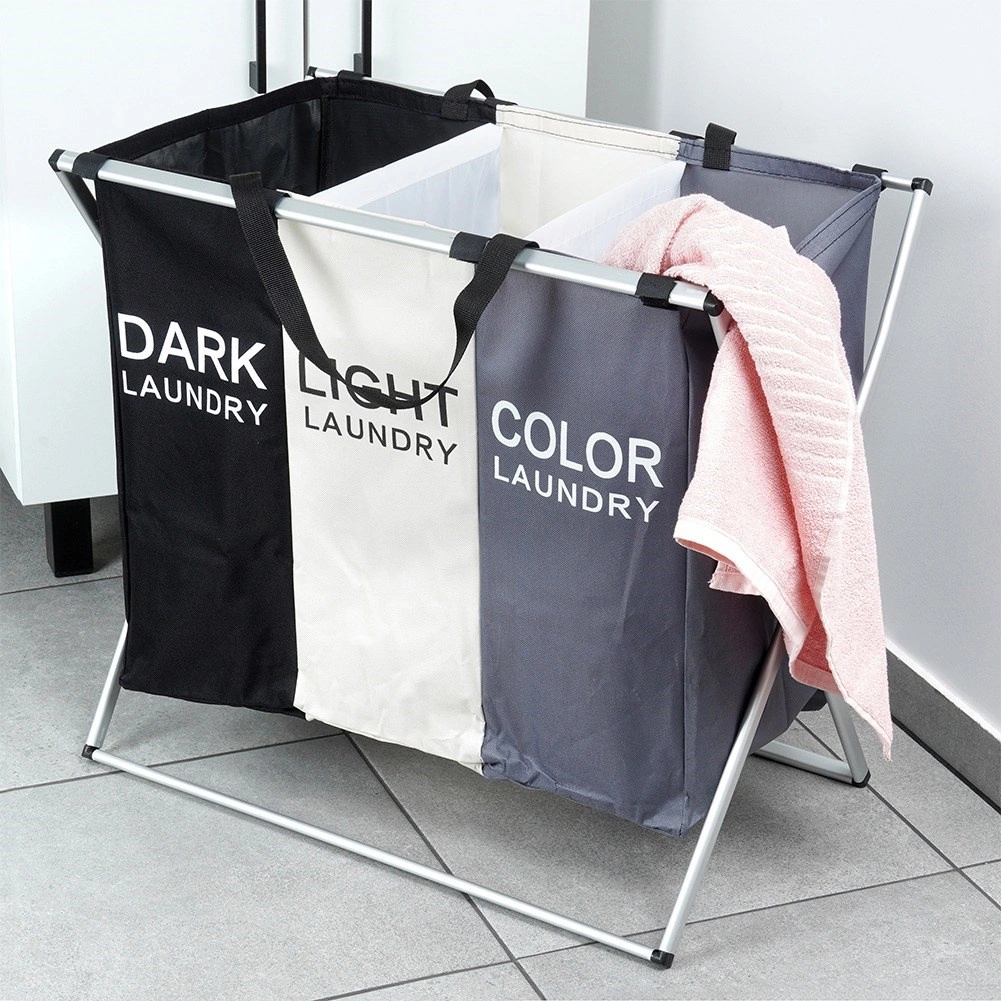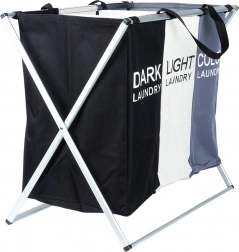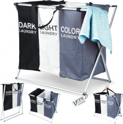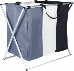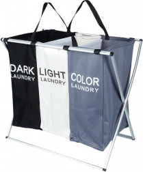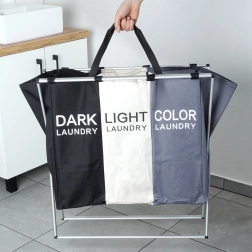 Hold styr på vasketøjet med en overskuelig tredelt kurv, der gør det muligt straks at sortere i mørkt, lyst og farvet. Den lette, men stabile metalramme i sølvfarve og de robuste tekstilposer sikrer lang holdbarhed og komfort i hverdagen.