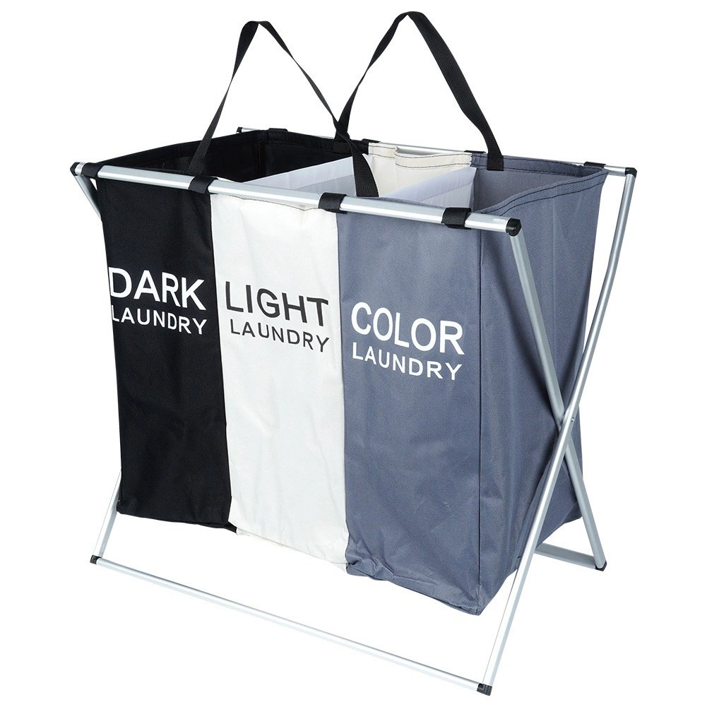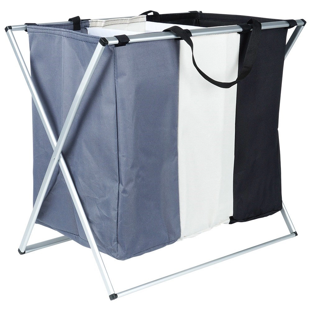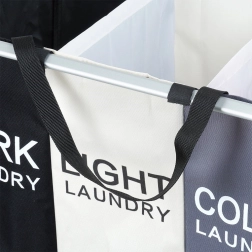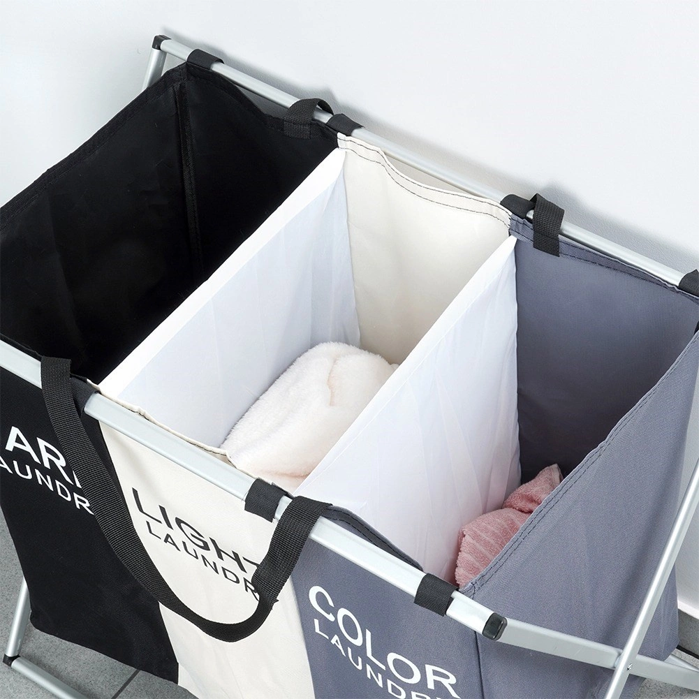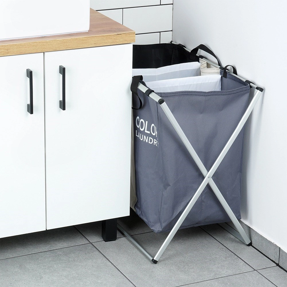 Hold styr på vasketøjet med en overskuelig tredelt kurv, der gør det muligt straks at sortere i mørkt, lyst og farvet. Den lette, men stabile metalramme i sølvfarve og de robuste tekstilposer sikrer lang holdbarhed og komfort i hverdagen.