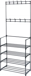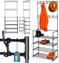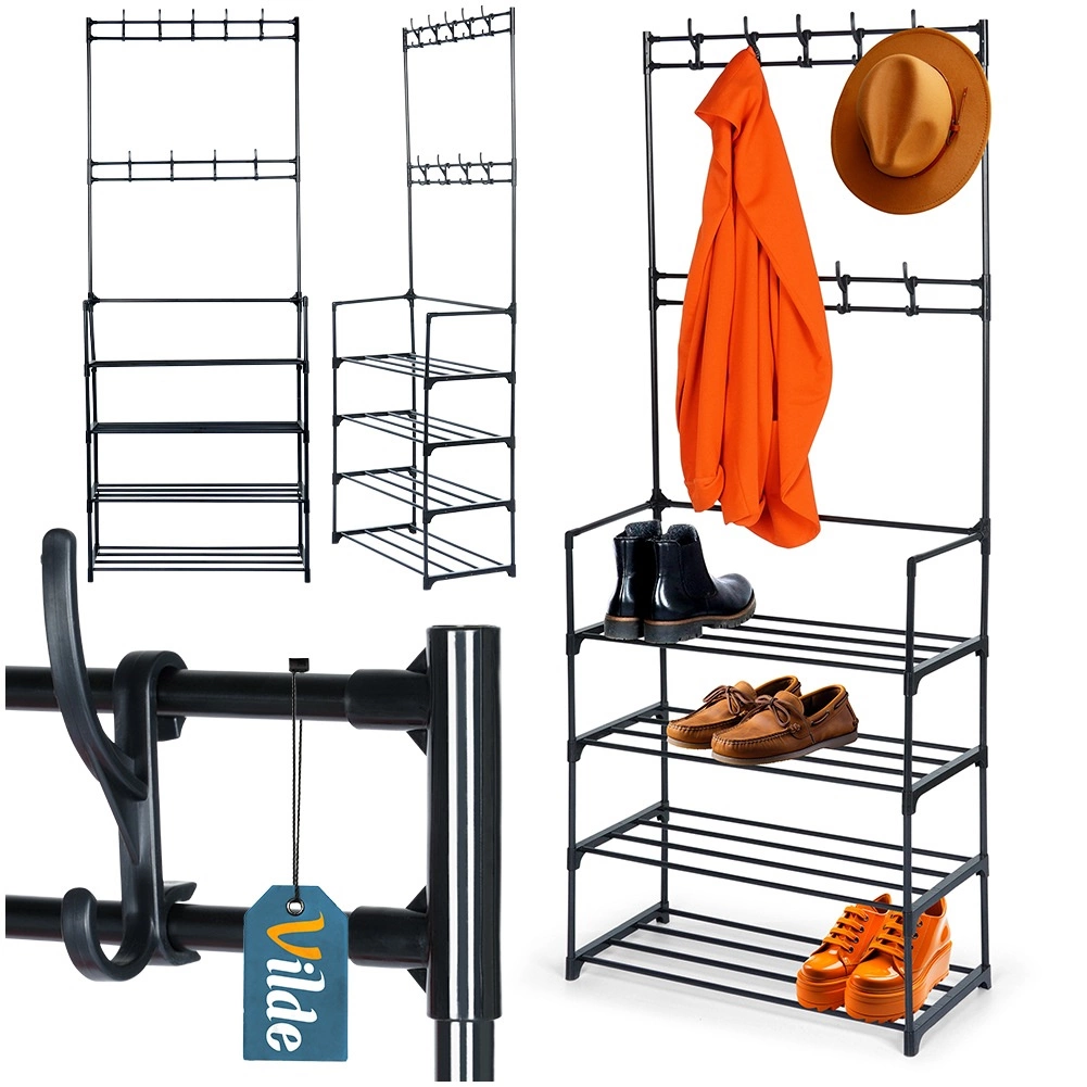 Praktisk stående tøjstativ med integreret skoreol kombinerer pladsbesparelse og et elegant industrielt LOFT-look. Det tilbyder 9 kroge til tøj og accessories samt 4 rummelige hylder til sko, tasker eller opbevaringsbokse. Den holdbare metalkonstruktion i sort sikrer stabilitet og lang levetid, og takket være de kompakte mål 57 × 28 × 156 cm passer den perfekt i entré, garderobe, kontor og venteværelse.