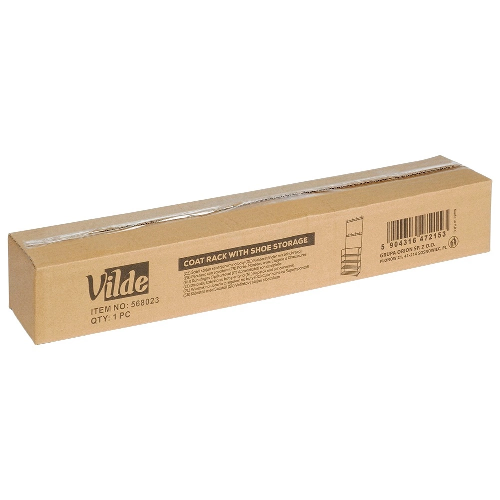 Forbedr organiseringen af indgangen med et multifunktionelt tøjstativ, der kombinerer stumtjener og skoreol i ét. Den slanke silhuet sparer plads, mens den robuste metalkonstruktion giver stabilitet og stil. Med 9 kroge kan den overskueligt rumme frakker, håndtasker, tørklæder og nøgler.