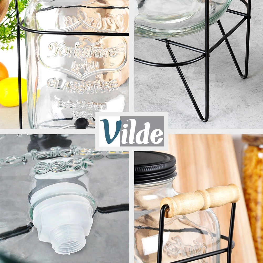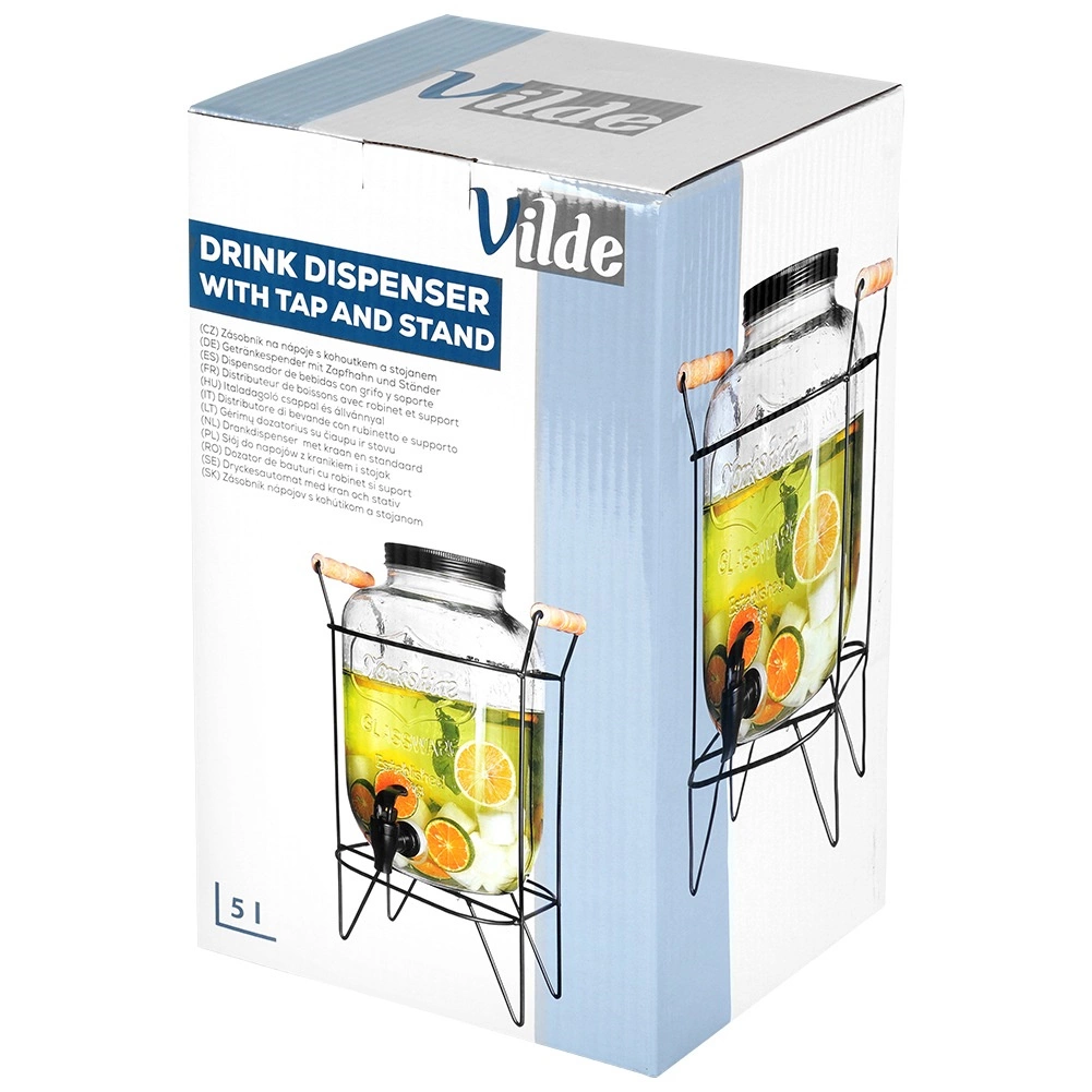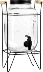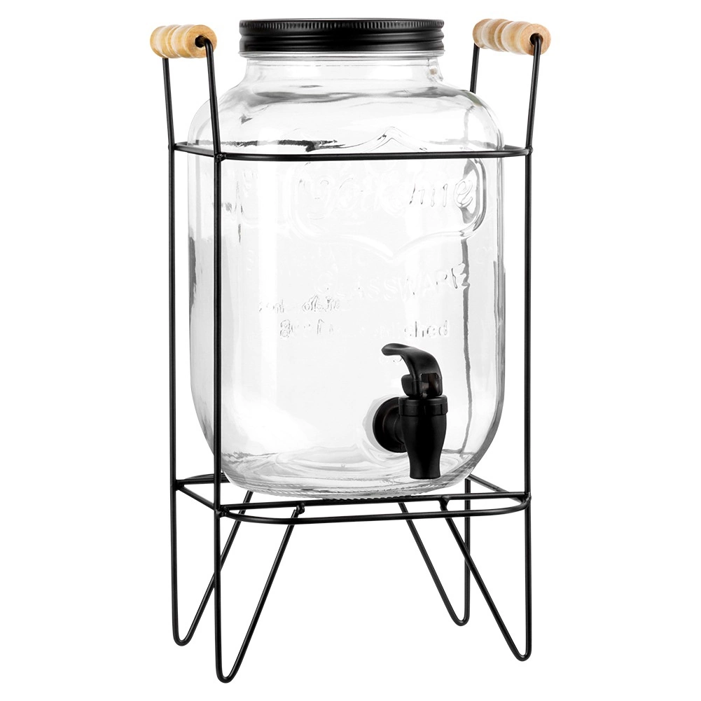 Den elegante dispenser af høj kvalitet i kraftigt glas gør sig godt på ethvert bord og gør det nemt at betjene gæster. Det forhøjede stativ i mat metal med træhåndtag giver plads til glas under hanen og sikrer stabilitet. Det sorte skruelåg beskytter drikken mod insekter og snavs.