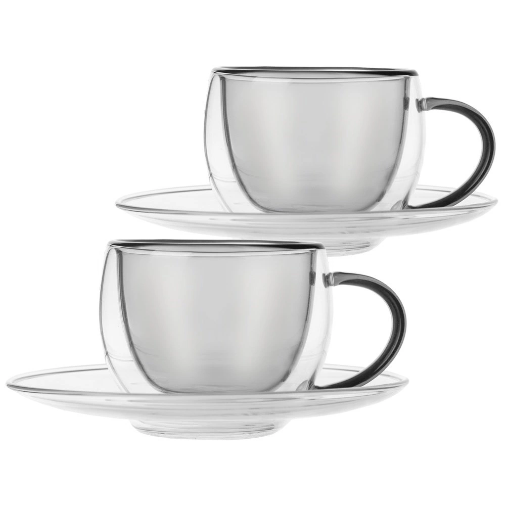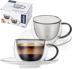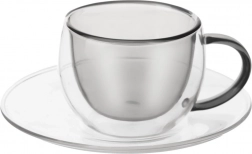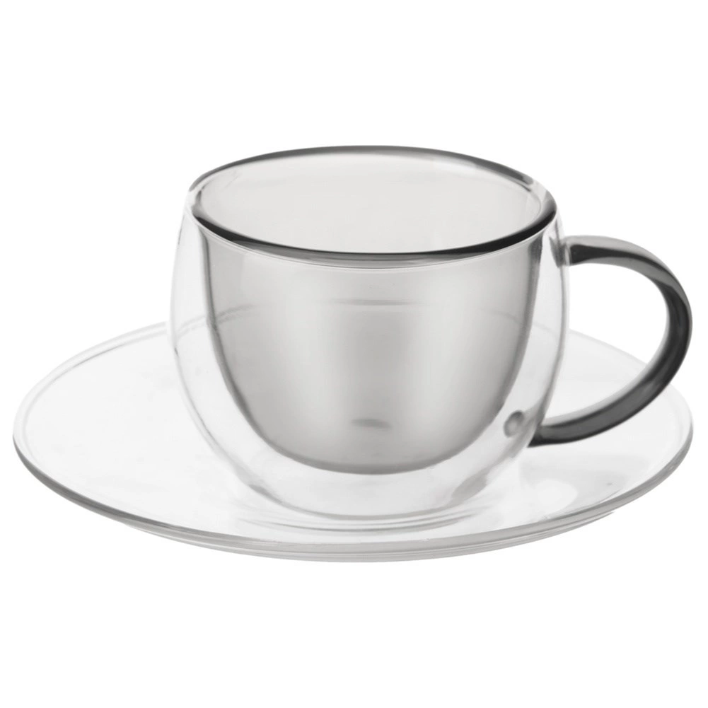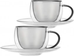 Opdag stilfulde termokopper, der kombinerer moderne udseende og funktionalitet. Den dobbeltvæggede borosilikatglas-konstruktion giver effektiv varme- og kuldeisolering, så varme drikke ikke brænder i hånden, og kolde drikke forbliver friske længere. Hver kop rummer 90 ml, måler 9 × 6,5 × 5,5 cm og suppleres af en perfekt tilpasset underkop med en diameter på 12 cm.