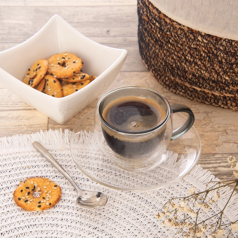 Det transparente design med mørk tone lader kaffens farve og crema træde frem – server din espresso effektfuldt og elegant.