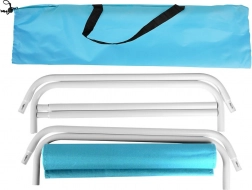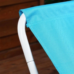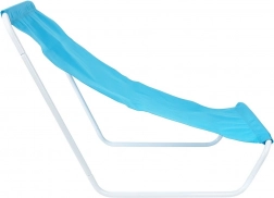 Liggestolen er designet til behagelig udendørs afslapning. Den robuste hvide metalramme og det stærke polyestervæv i blå sikrer stabilitet og en behagelig siddestilling i en lav, afslappet position. Takket være den smarte sammenklappelige mekanisme kan du nemt pakke den i den medfølgende taske og tage den med på stranden, picnic eller ferie.