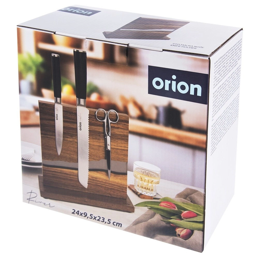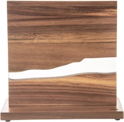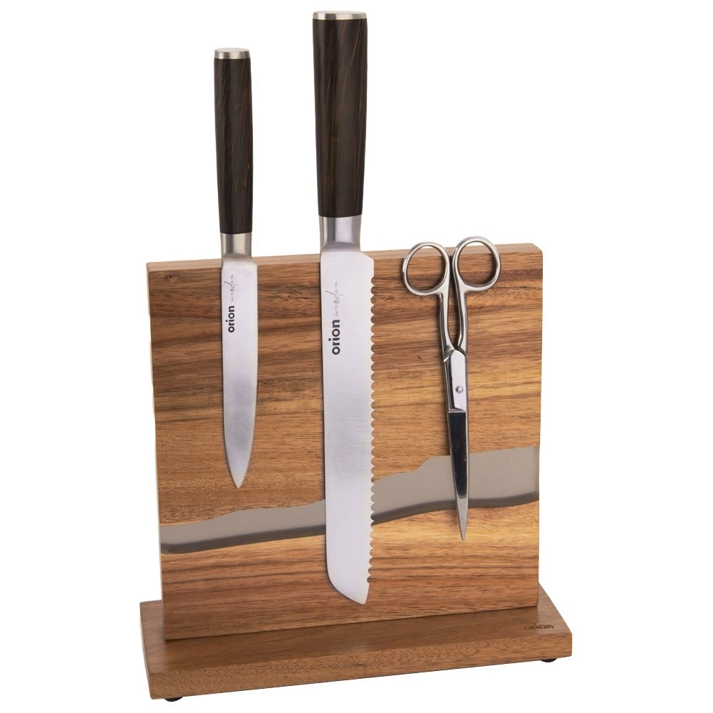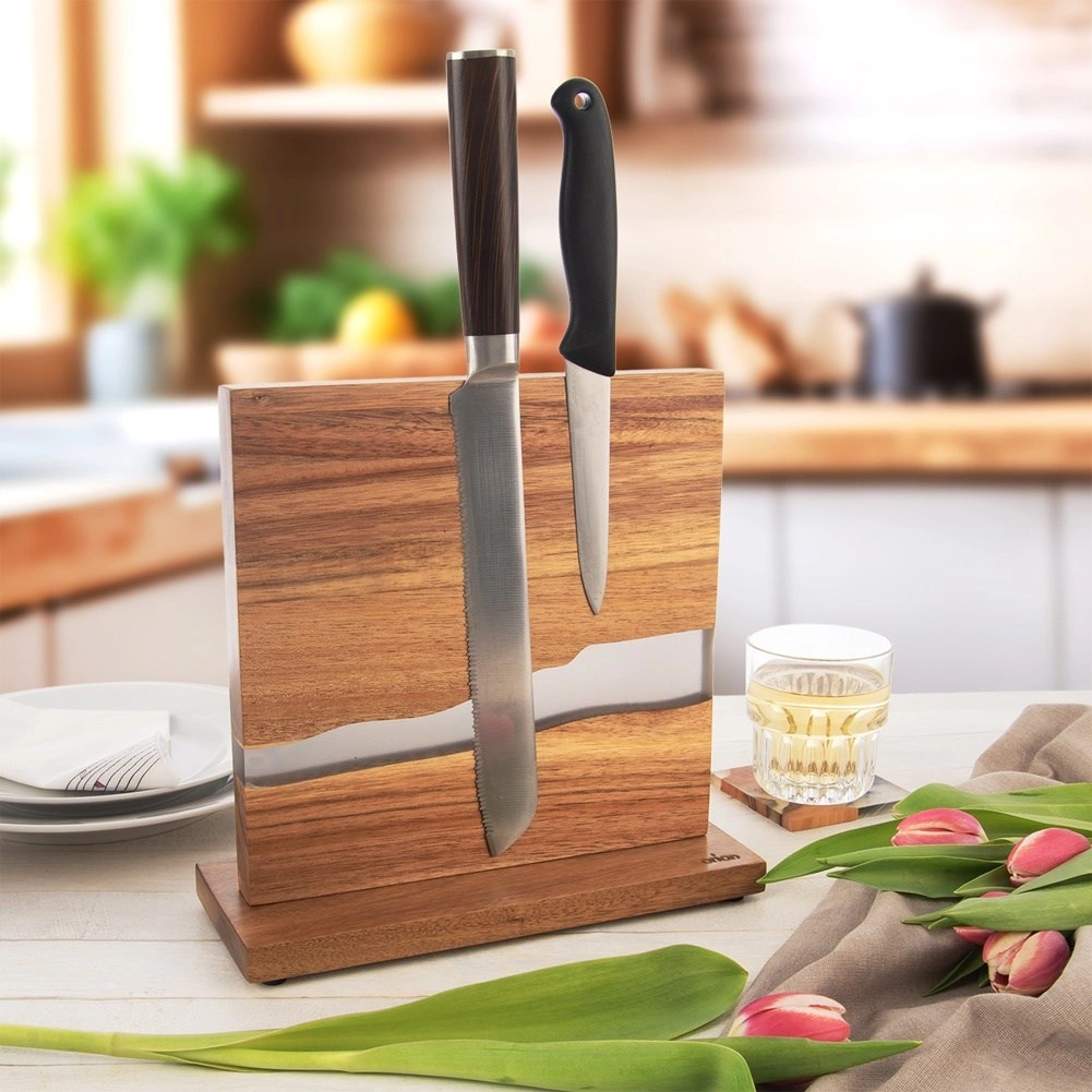 Elegant, dobbeltsidet knivholder i naturligt akacietræ med dekorativ harpiks i “river”-stil tilbyder en stærk magnetisk flade, sikker og overskuelig opbevaring af knive og sakse samt et moderne design, der passer i alle køkkener. Takket være den dobbeltsidede opbevaring sparer den plads på bordpladen, og filtpadder under basen beskytter arbejdsfladen mod ridser.