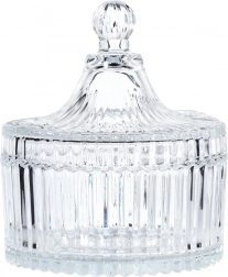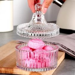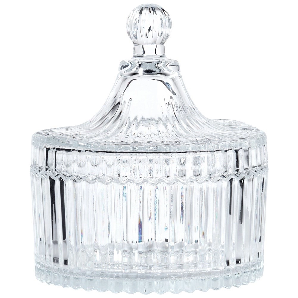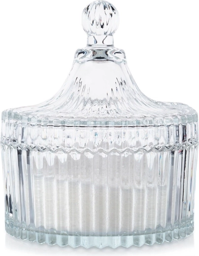 Denne sukkerskål kombinerer funktionalitet og tidløst design. Vertikale riller og fine facetterede detaljer giver beholderen et luksuriøst udseende, mens det gennemsigtige glas gør det let at se indholdet. Højden uden låg er 5 cm, så den passer nemt på bordet og i hylden.