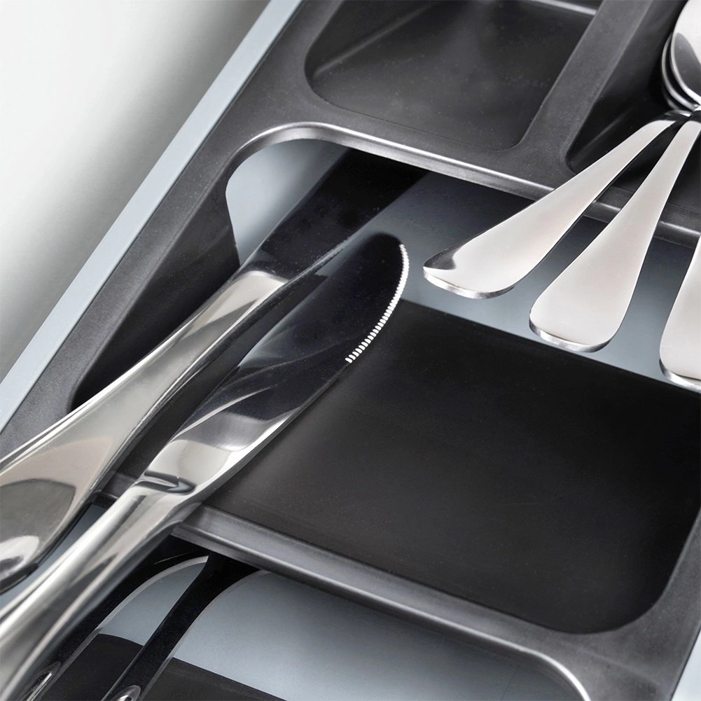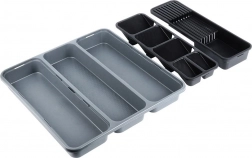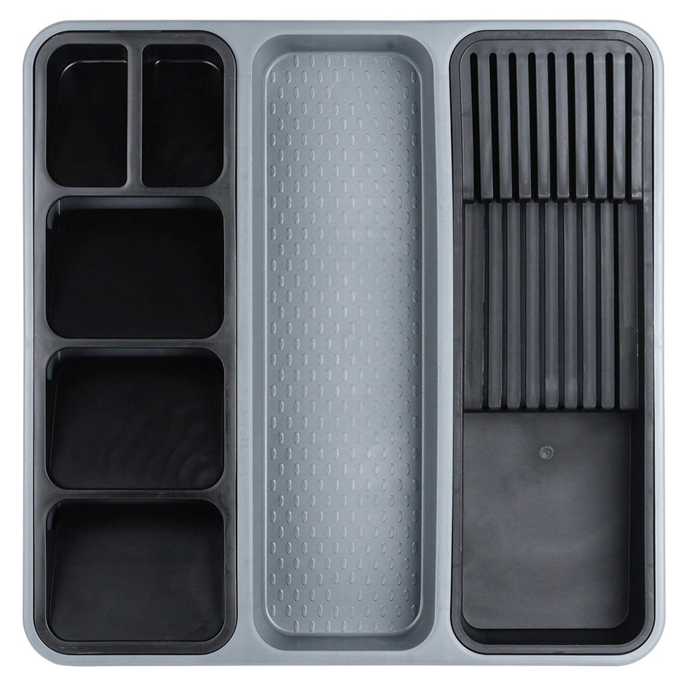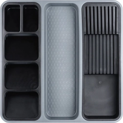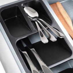Indersiden af det midterste rum har en skridsikker overflade, som forhindrer, at bestik og redskaber flytter sig. Den kvalitetsrige plast i grå farve med sorte indsatser er holdbar, let at vedligeholde og kan kommes i opvaskemaskinen. Et ideelt tilbehør til ethvert køkken, der sparer plads og gør madlavningen hurtigere.