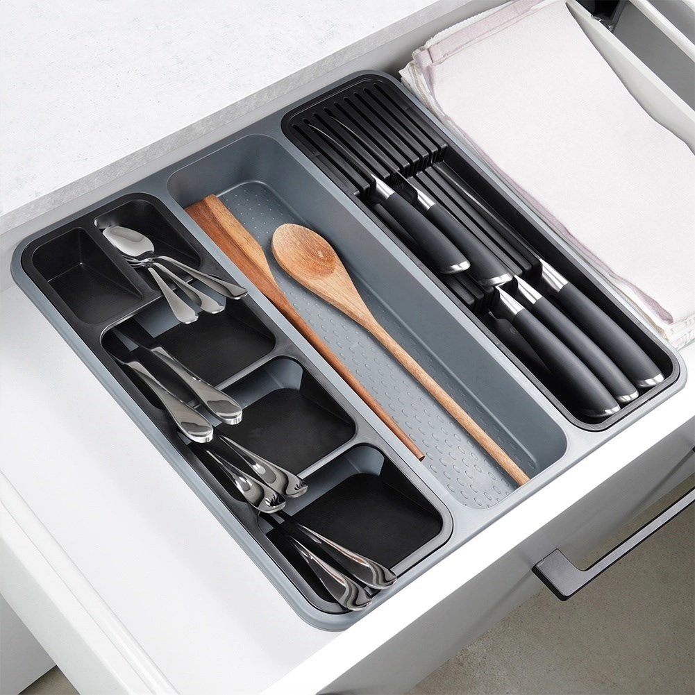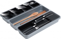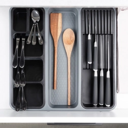 Få styr på køkkenet på et øjeblik. Denne grå organizer i målene 40 × 40 × 5 cm byder på en smart opdeling af rummene inklusive aftagelige indsatser – den ene beregnet til op til 9 knive, den anden til overskuelig sortering af bestik. På den måde bliver hver del på sin plads, og skuffen forbliver ryddelig.