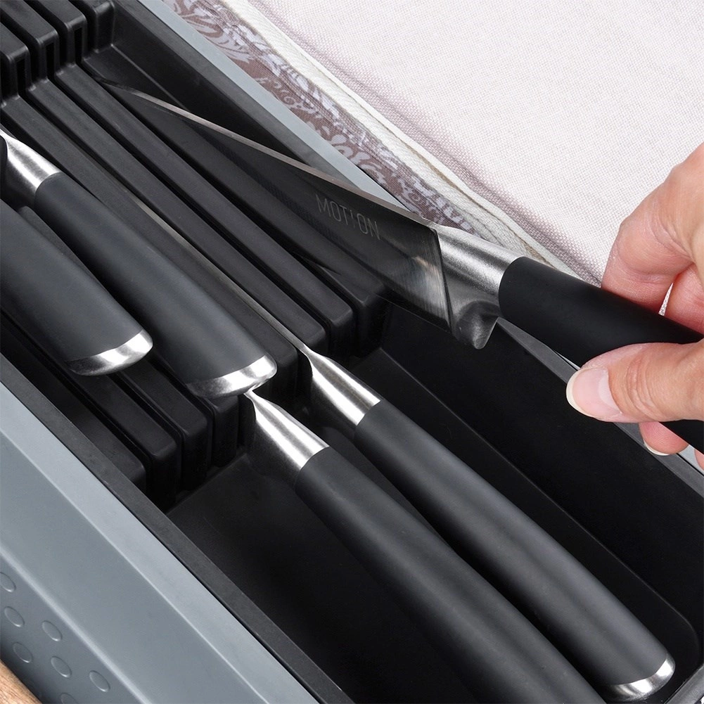 En specialblok med separate riller holder knivene adskilt, beskyttede og altid tilgængelige. Spar plads og øg sikkerheden i skuffen.