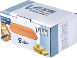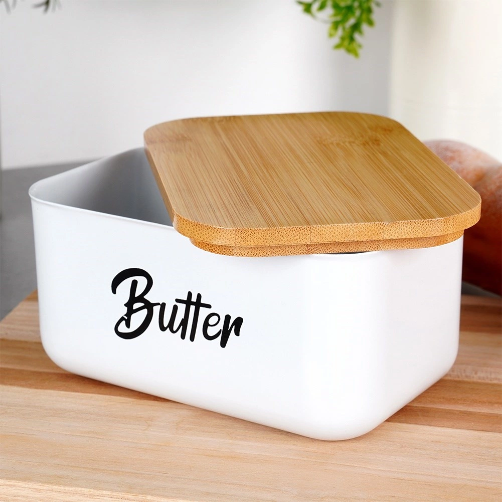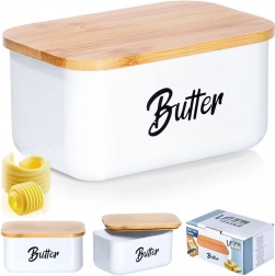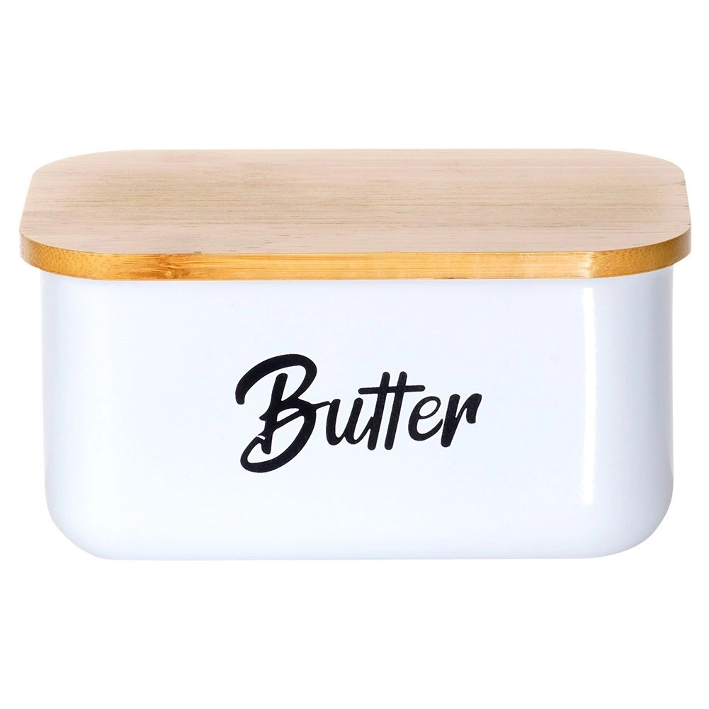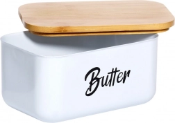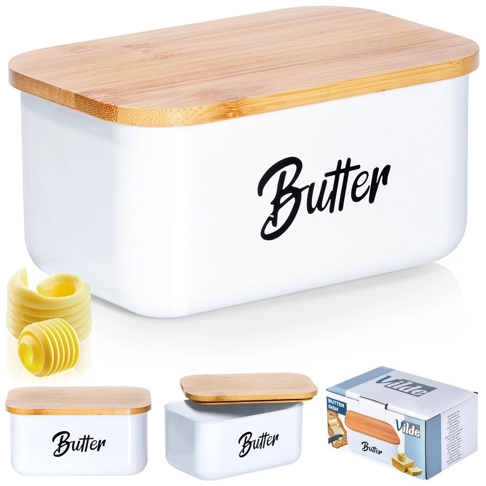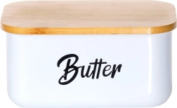 Hvid pulverlakeret stål og et naturligt bambuslåg giver dit køkken et moderne, rent udtryk og beskytter samtidig smørret på en praktisk måde.