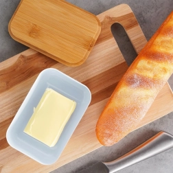 Det robuste bambuslåg dækker smørret sikkert og kan også bruges som en lille skære- eller serveringsflade.
