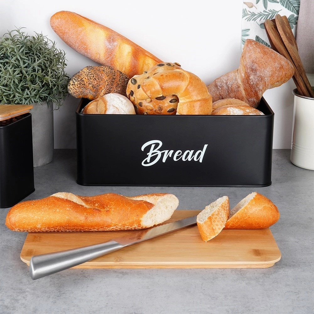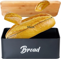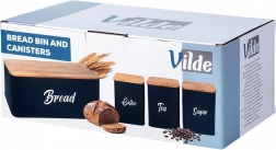 Brødkassen i robust, pulverlakeret metal har rene linjer og et praktisk låg af bambustræ, som kan bruges som skærebræt. Metalkonstruktionen beskytter bagværk mod at blive klemt og begrænser udtørring. De tre matchende dåser med bambuslåg holder sukker, kaffe og te aromatiske længere og nemt organiseret.