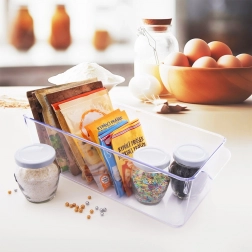 Fremstillet af kvalitets, holdbar plast, som er sikker til kontakt med mad. Glatte kanter, let vedligeholdelse og universel anvendelse – ikke kun i køleskabet, men også i spisekammeret, på hylder eller i garderoben og på kontoret.