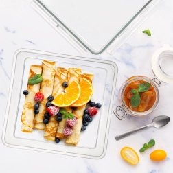 Denne lave, firkantede madkasse med en kapacitet på 900 ml giver pålidelig og hygiejnisk opbevaring af dine retter. Det gennemsigtige korpus gør det muligt straks at se indholdet uden at åbne, mens det robuste låg med 4 klips og silikonepakning sikrer tæthed og minimerer lugtudslip.