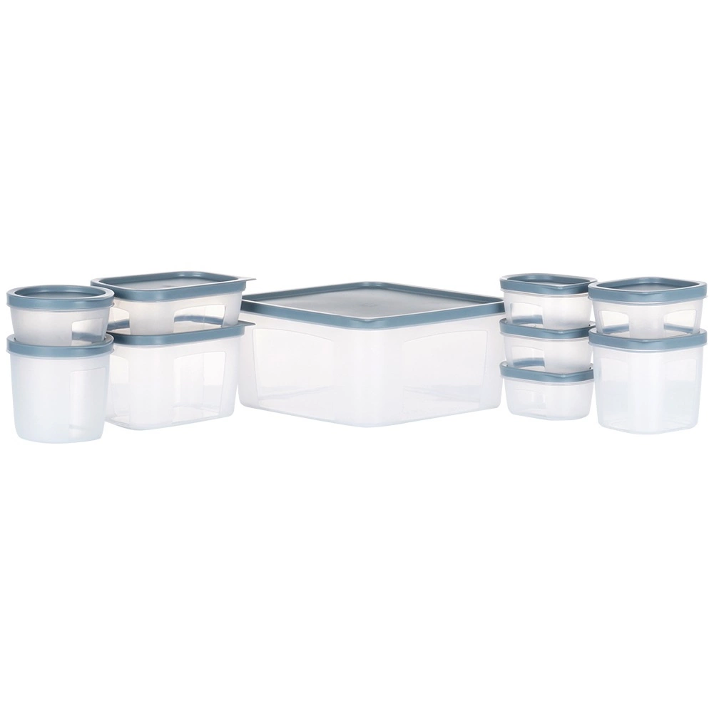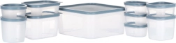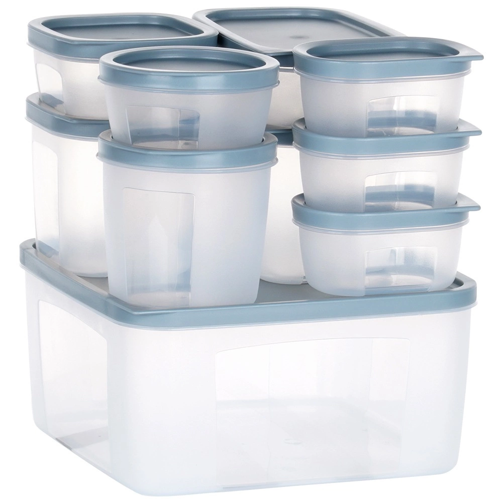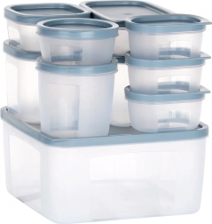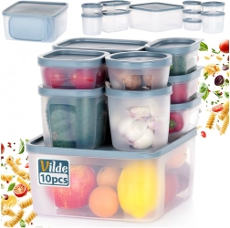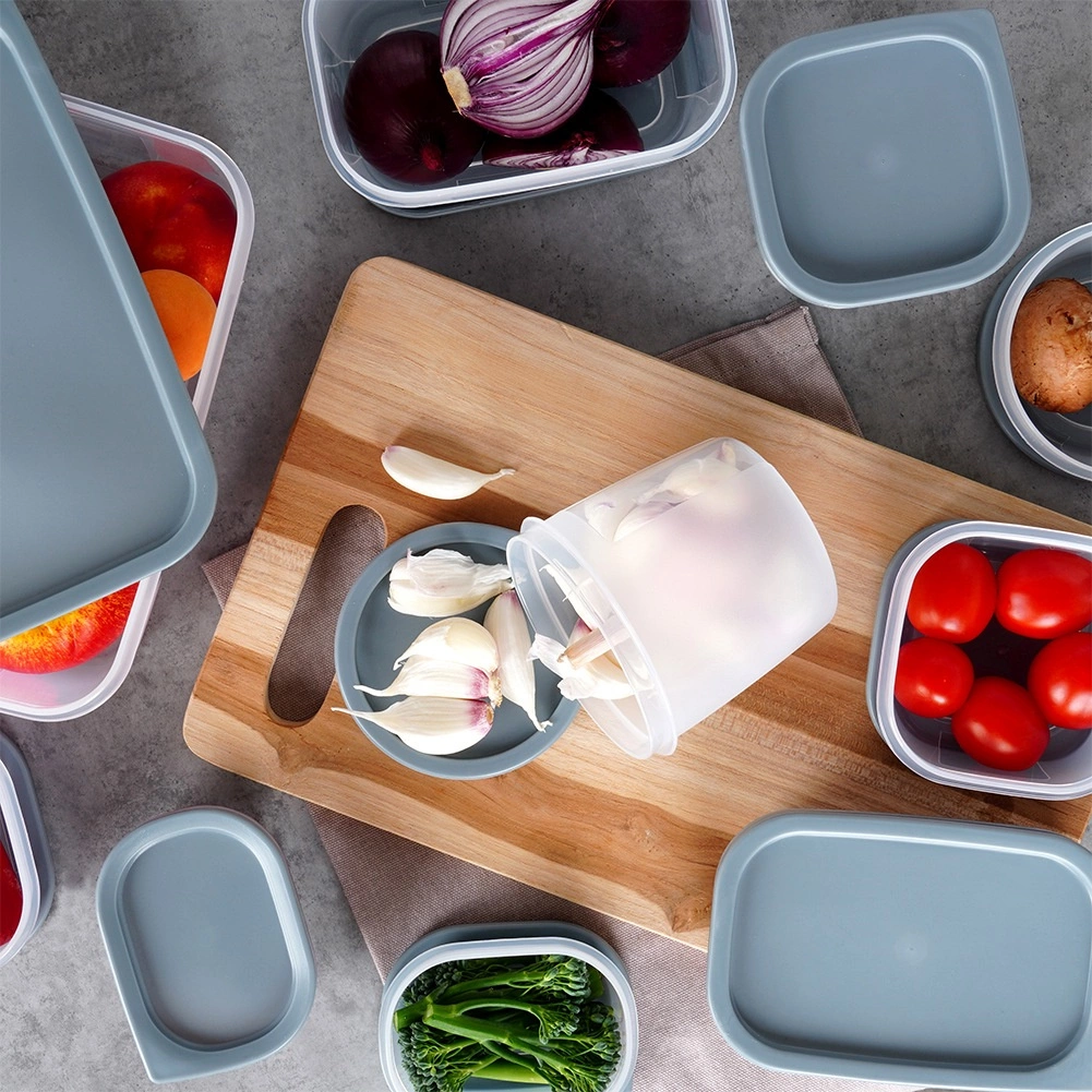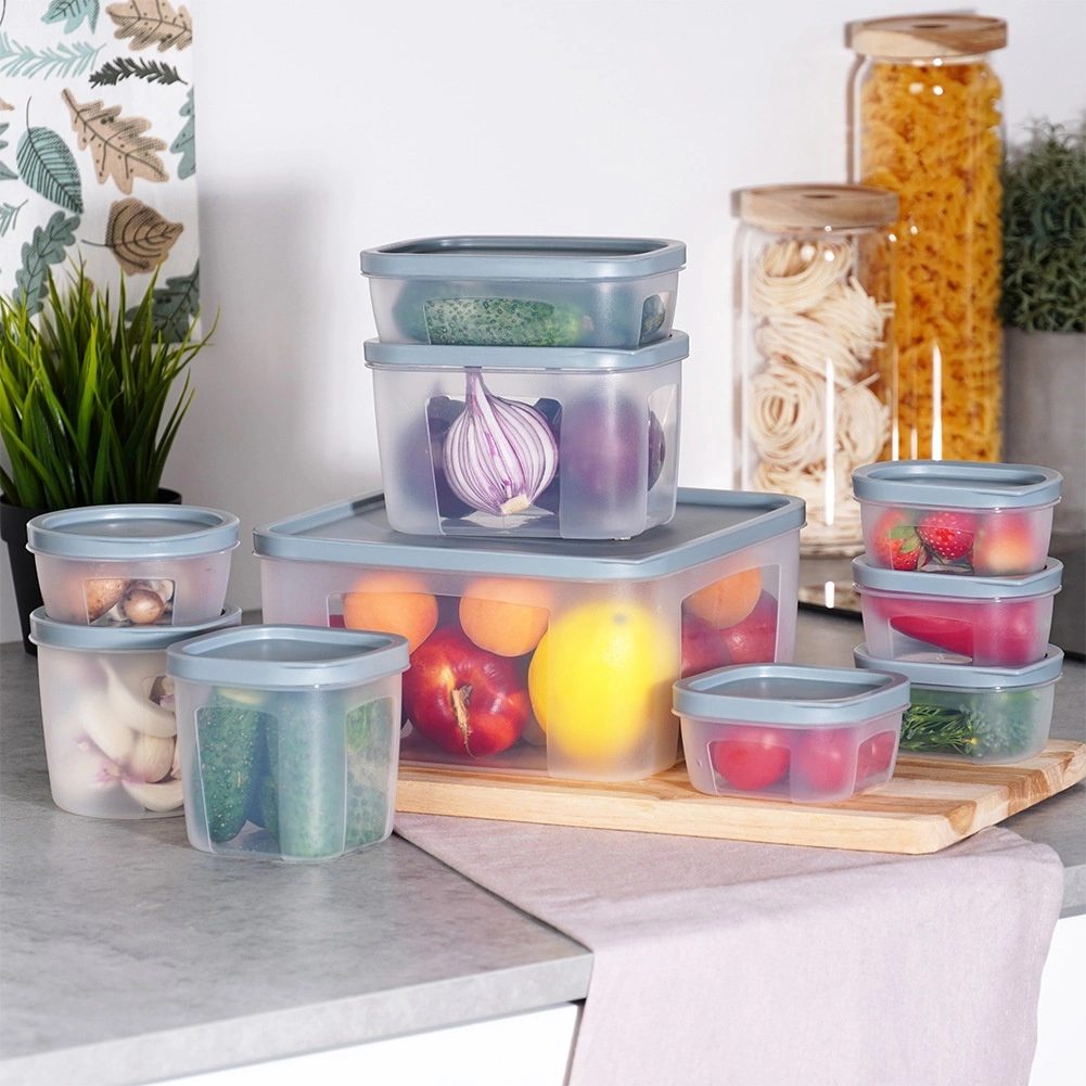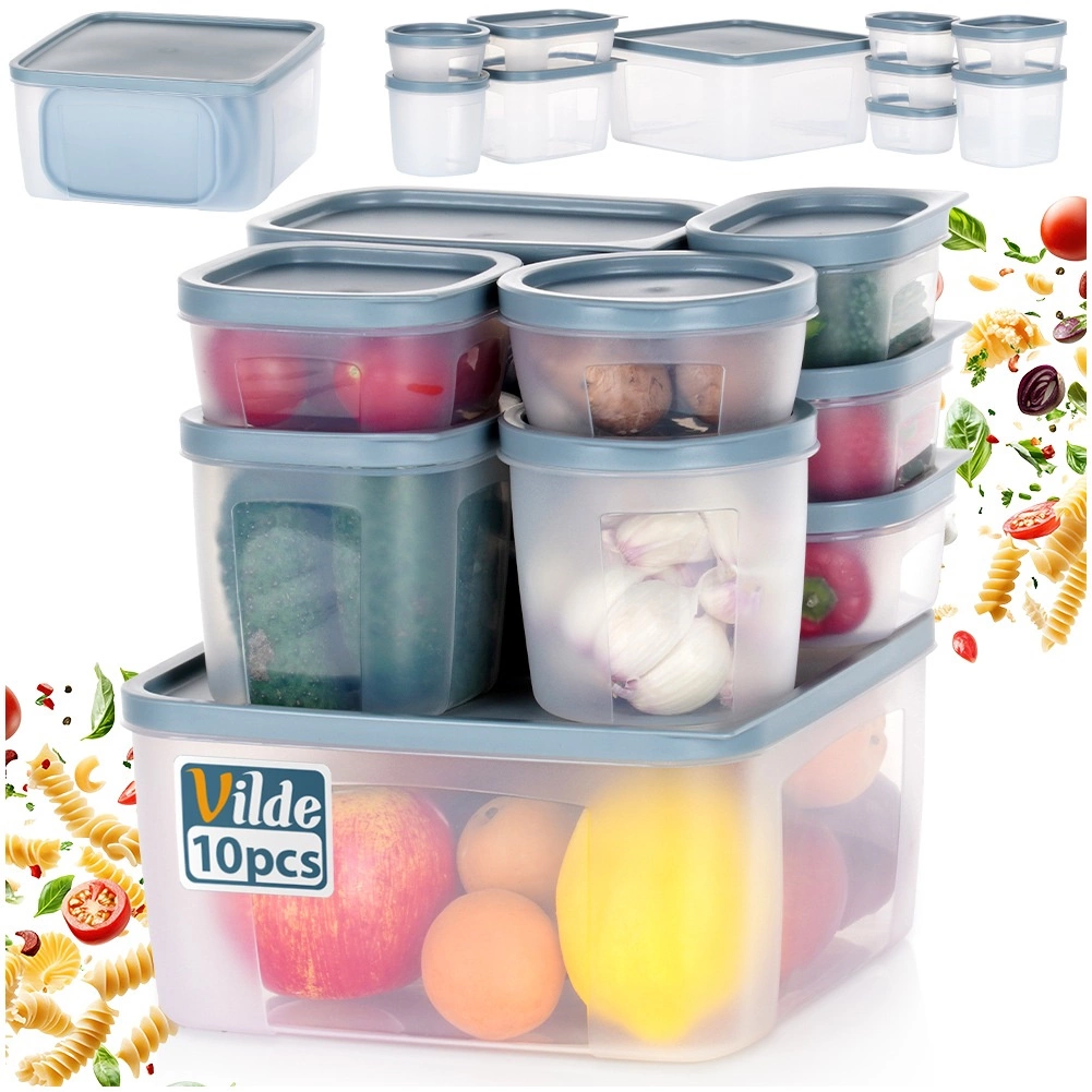Praktisk sæt med 10 madopbevaringsbokse med grå låg til overskuelig og hygiejnisk opbevaring i køkkenet. Forskellige størrelser til frugt, grøntsager, snacks og tørvarer. Boksene er lufttætte, stabelbare og velegnede til køleskab, fryser og opvaskemaskine.