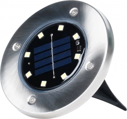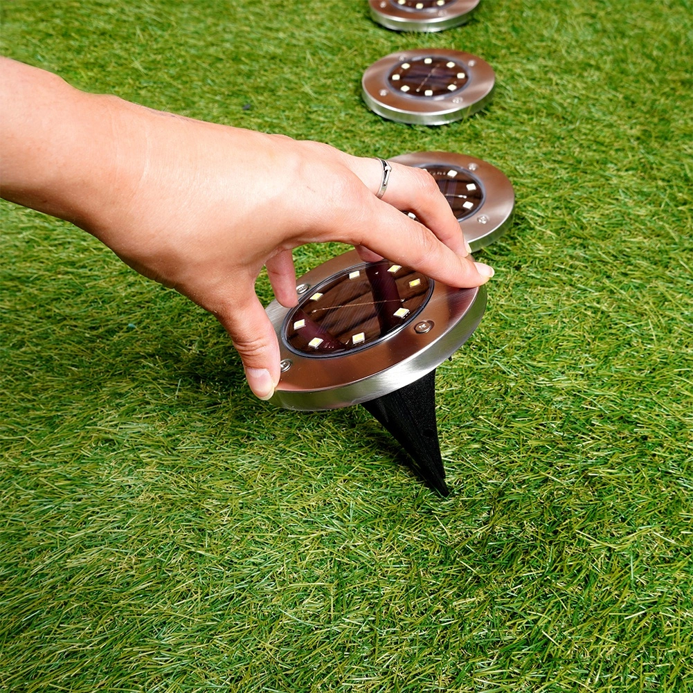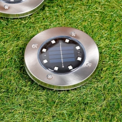 Diskformede solcellelamper med ramme i rustfrit stål og sort jordspids falder diskret ind i plænen eller gruset og lyser pålideligt stier og bedkanter op om aftenen. De oplades af solen, tænder automatisk ved skumring og skaber både sikker orientering og en behagelig atmosfære.