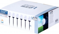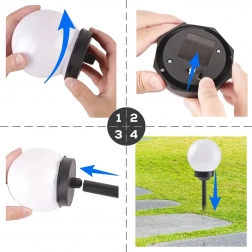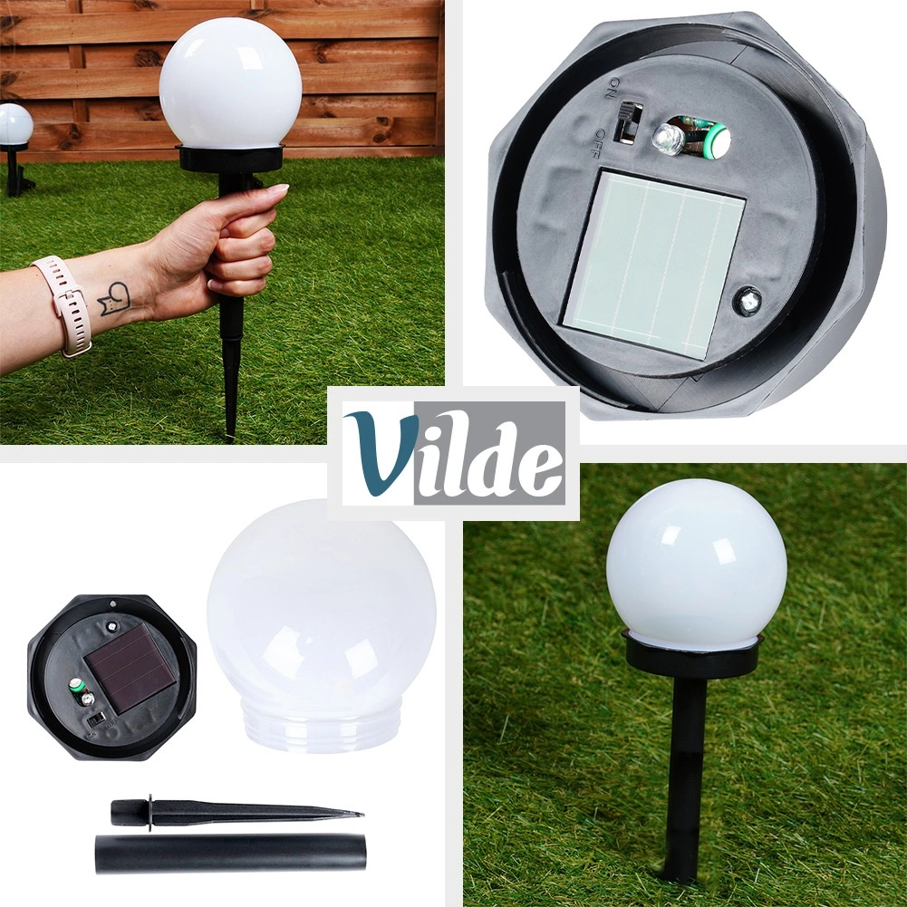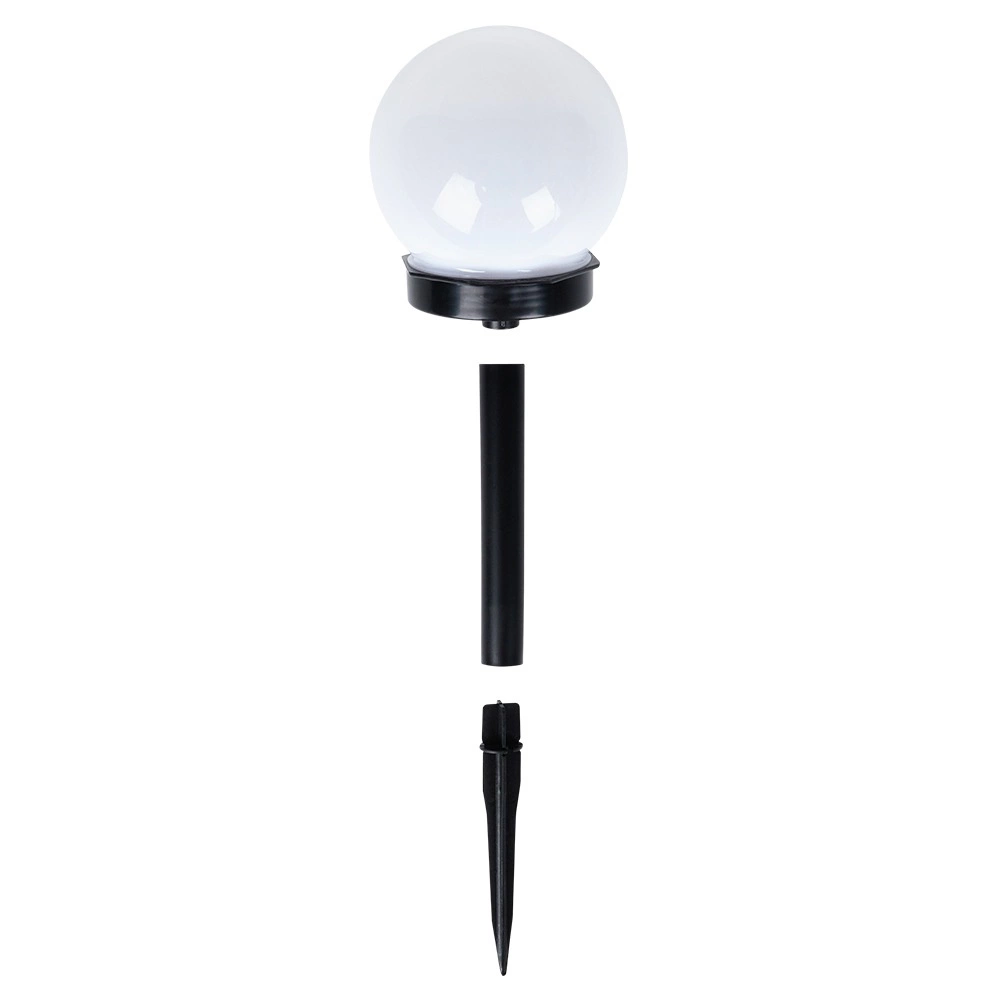 Hver lampe består af en kugle, en forlængerstang og en spids til nem nedstikning i jorden. Den integrerede skumringssensor tænder lampen automatisk efter mørkets frembrud, og en kontakt giver mulighed for manuel kontrol. Takket være IP44 er lamperne beskyttet mod stænkende vand og støv.