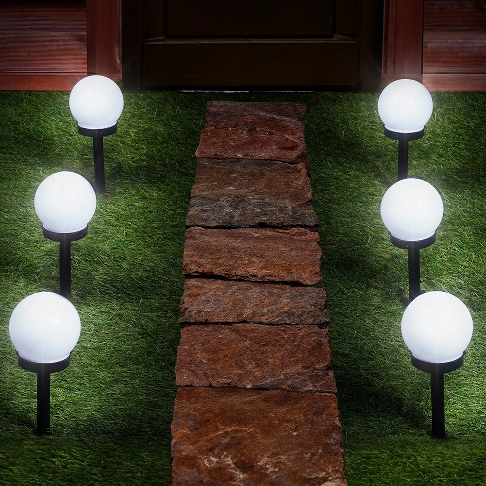 Sættet med seks kuglelamper belyser jævnt gangstier og havearealer. IP44-klassificeret til udendørs brug.