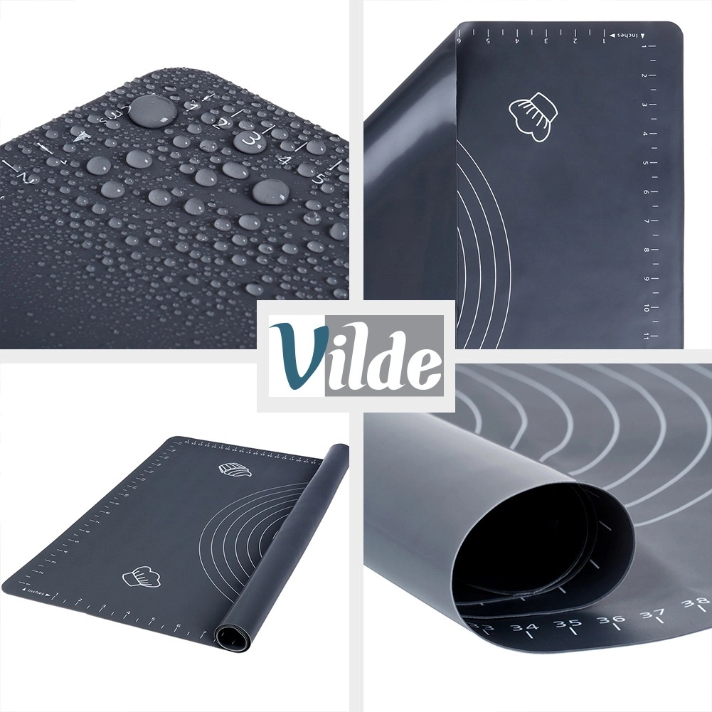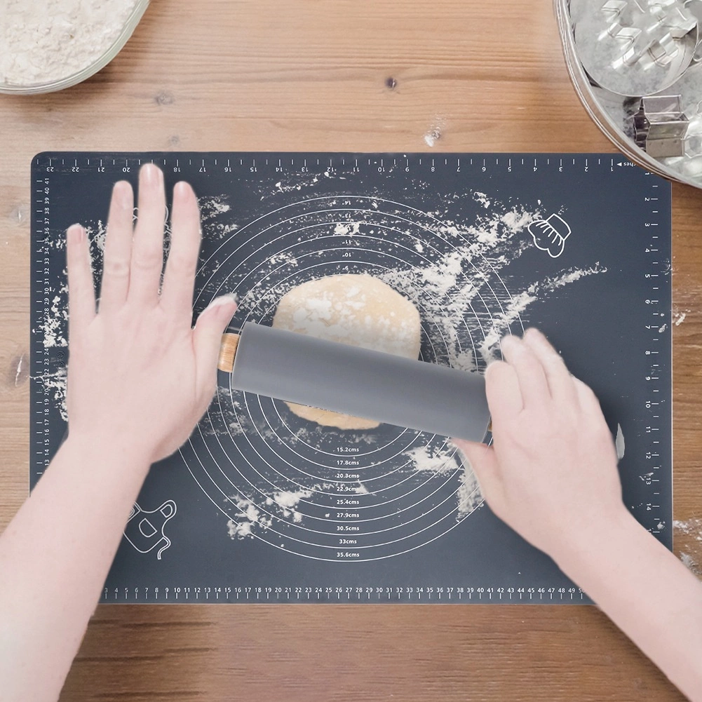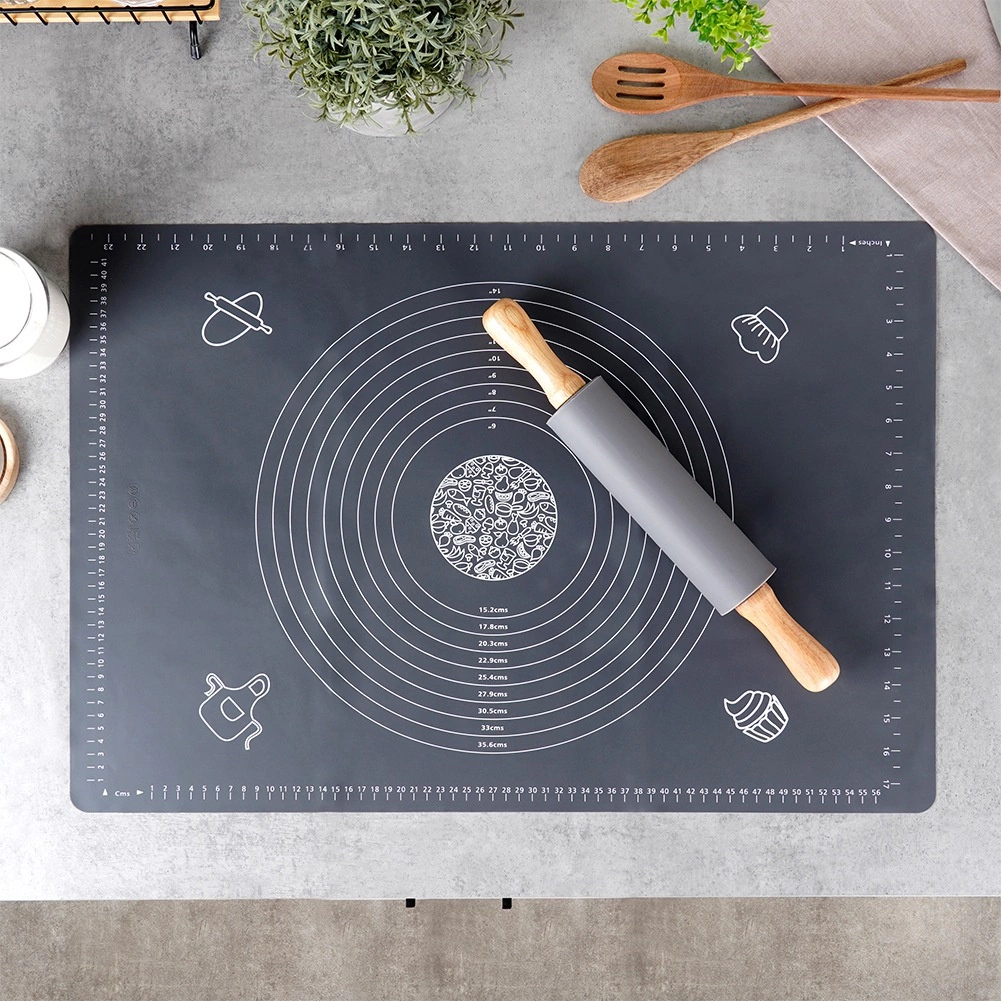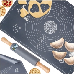 Dette alsidige sæt af højkvalitets silikone i elegant grå er ideelt til at forberede dej til tærter, pizza, småkager, pasta og dumplings. Måtten er non-stick og skridsikker, så den ligger fast på bordpladen, og dejen klistrer ikke. Den er let at rengøre, optager ikke lugte og tørrer hurtigt.