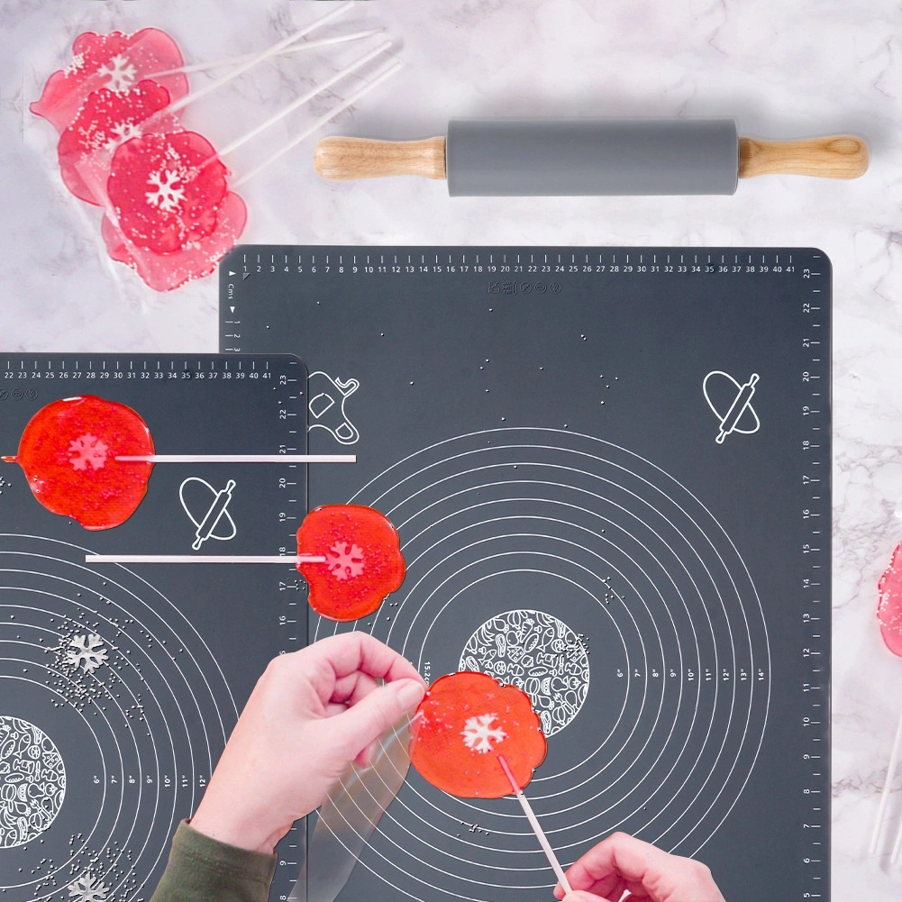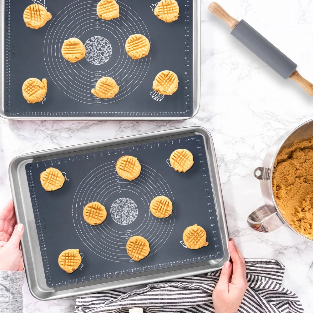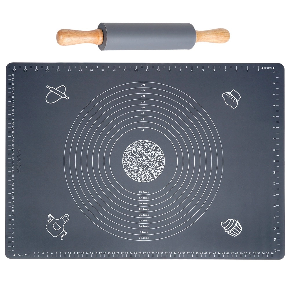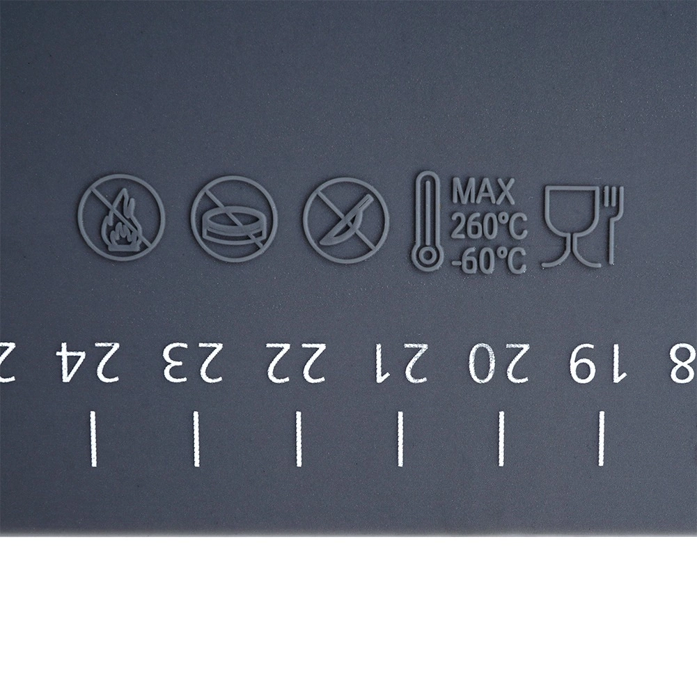 Dette alsidige sæt af højkvalitets silikone i elegant grå er ideelt til at forberede dej til tærter, pizza, småkager, pasta og dumplings. Måtten er non-stick og skridsikker, så den ligger fast på bordpladen, og dejen klistrer ikke. Den er let at rengøre, optager ikke lugte og tørrer hurtigt.