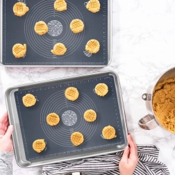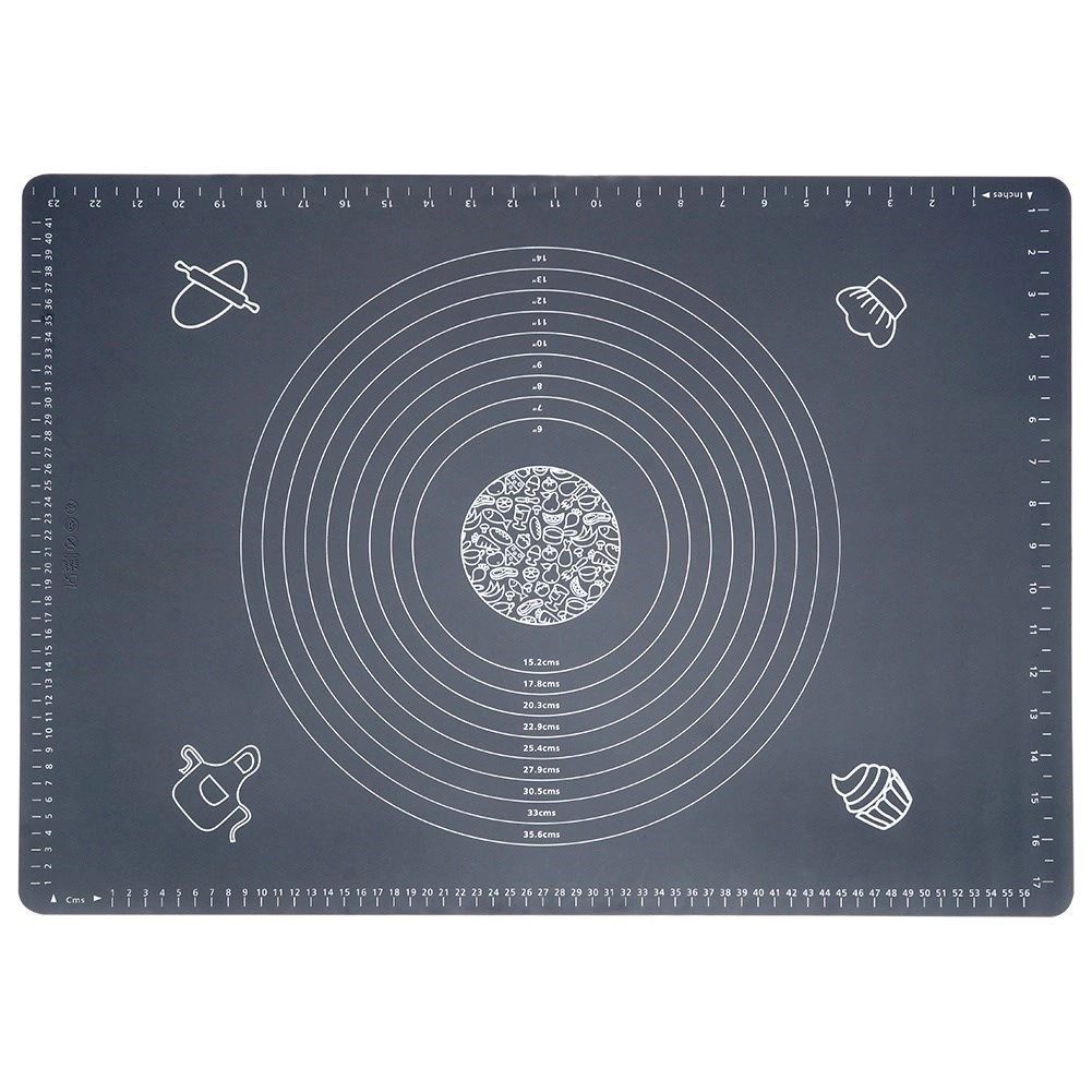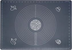 Integrerede linealer i cm og koncentriske cirkler hjælper dig med nemt at rulle pizza, tærtebund eller småkager ud til den ønskede diameter. Måtten er lavet af holdbar fødevaregodkendt silikone, som tåler både frost og høje temperaturer, så du kan bruge den som bageunderlag i ovnen og efterfølgende vaske den trygt i opvaskemaskinen.