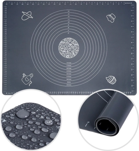 Praktisk silikonemåtte til dej i størrelsen 64 × 45 cm, der kombinerer arbejdsbord og bageunderlag i ét. Den har non-stick overflade, skridsikker fastgørelse til bordet og præcise målemarkeringer i centimeter samt koncentriske cirkler for nem formning af pizza, tærter og småkager. Den er varmeresistent fra -40 °C til +260 °C, egnet til ovn, mikroovn, fryser og opvaskemaskine, er let at rengøre og kan rulles sammen for at spare plads.