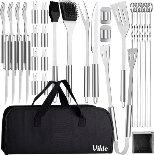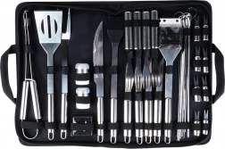 Indhold i sættet: 1× spatel (35 cm), 1× tang (34,5 cm), 1× gaffel (35 cm), 1× kniv (32 cm), 1× pensel med silikonebørster (34 cm), 8× spyd (35 cm), 1× saltbøsse (3,5 × 5,5 cm), 1× peberbøsse (3,5 × 5,5 cm), 1× grillbørste med skraber (34 cm) + 1× ekstra hoved, 8× majsholder (7 cm), 4× spisegafler (21 cm), 4× spiseknive (24 cm), 1× etui.