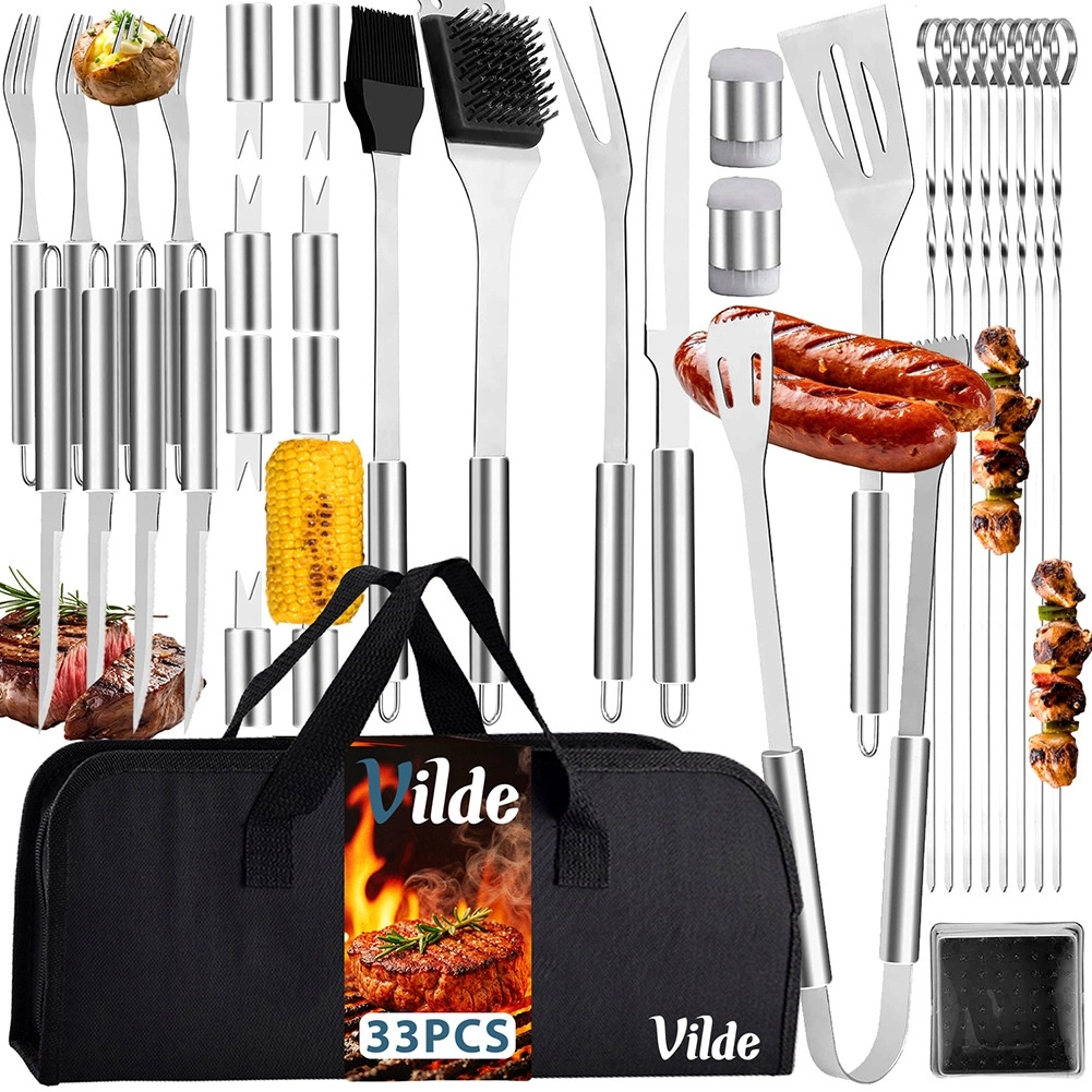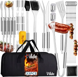 Dette alsidige grillredskabssæt tilbyder 33 nøje udvalgte dele i rustfrit stål til daglig grillning hjemme og på farten. Lange håndtag med ophængsøje sikrer sikker afstand fra varmen og behagelig håndtering. Det praktiske tekstiletui med solide håndtag gør både opbevaring og transport nem, så du altid har alt ved hånden og pænt organiseret.