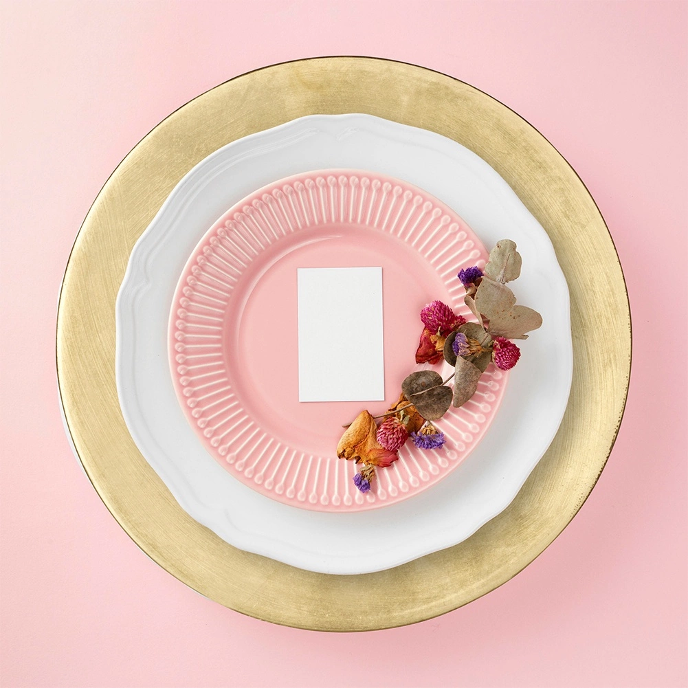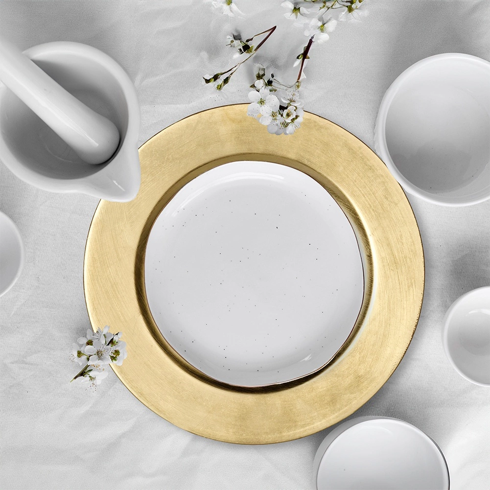 Den brede kant og den skinnende overflade forvandler enhver borddækning til en festlig opstilling – ideel til bryllupper, fester og højtider.