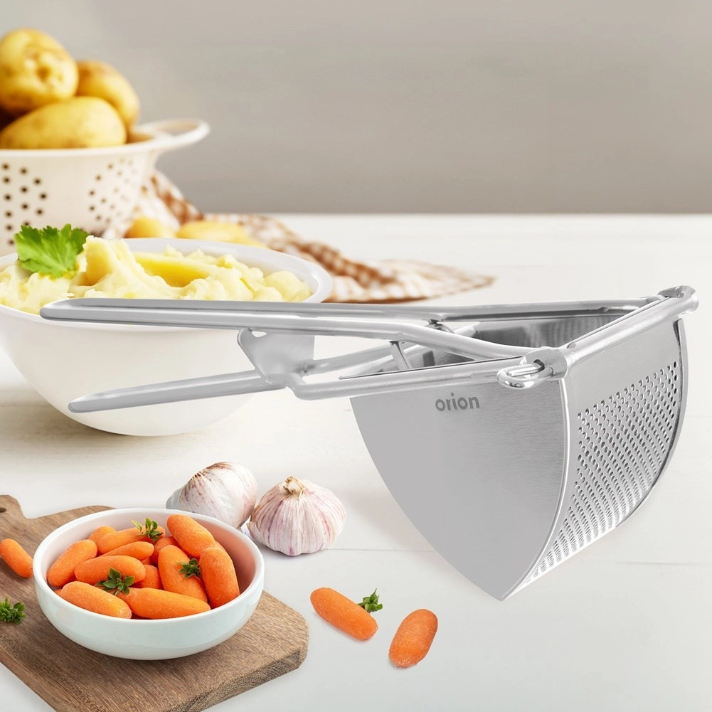 Den praktiske ORION kartoffelpresser i rustfrit stål sikrer glat puré uden klumper og gør det nemt at tilberede gnocchi, dumplings og kartoffelmos. Takket være den robuste konstruktion i rustfrit stål og de lange håndtagsarme opnås tilstrækkeligt tryk uden besvær. Den er let at rengøre og ideel til kartofler, grøntsager og frugt.