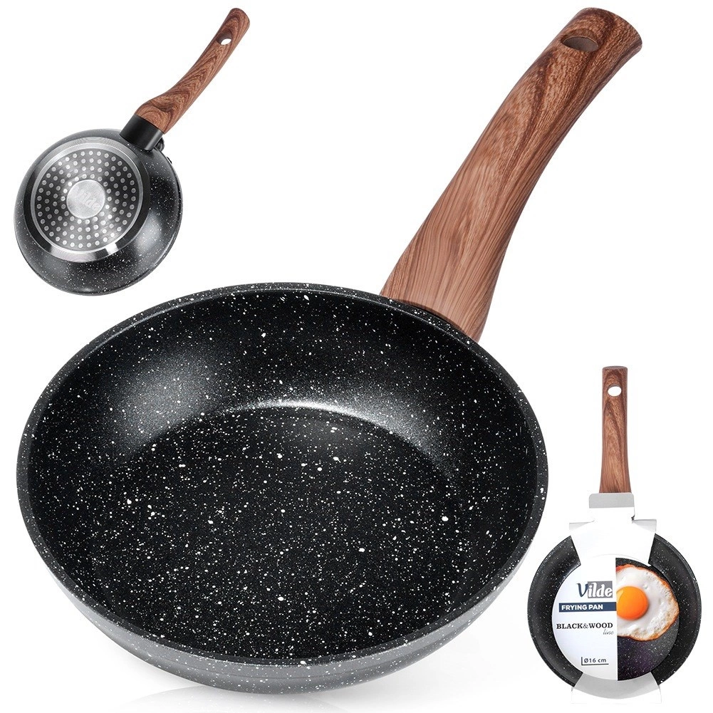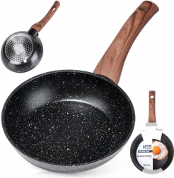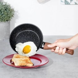 Denne alsidige pande i støbt aluminium med granit non-stick belægning er ideel til stegning og sautering af mindre portioner – æg, grøntsager eller kød. Det stilfulde design i sort med håndtag i trælook passer perfekt i det moderne køkken og gør den daglige madlavning lettere.