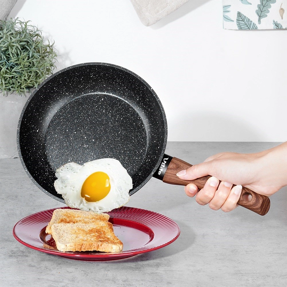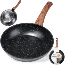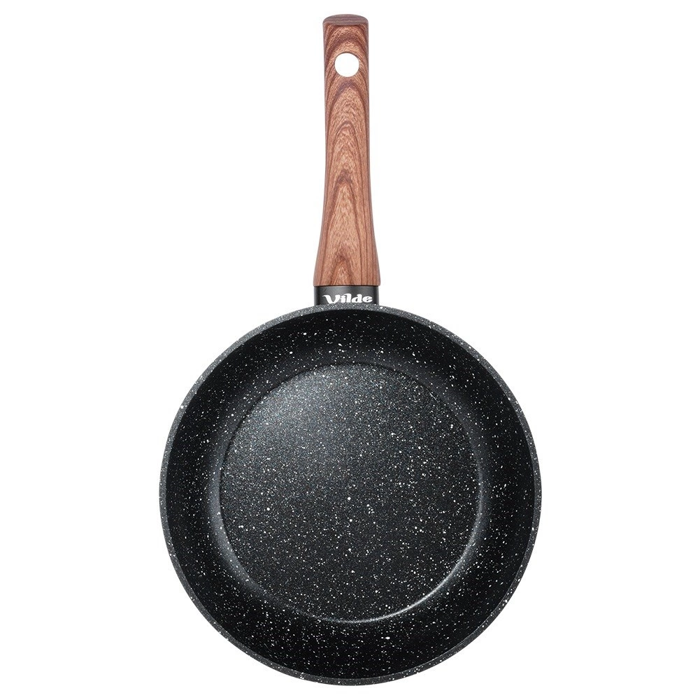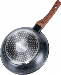 En stilfuld pande i en moderne kombination af sort og træ er ideel til daglig stegning og sautering. Det holdbare aluminiumsstøbegods varmes hurtigt op, og den granitbaserede non-stick belægning sikrer let frigivelse af maden uden fastbrænding – der skal kun en dråbe olie til.