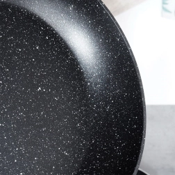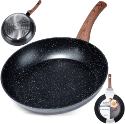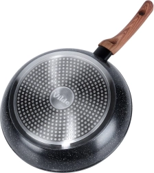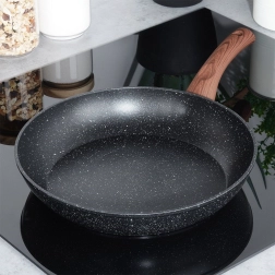 Stilfuld granitpande med en diameter på 28 cm til daglig madlavning. Takket være den non-stick stenbelægning, hurtig og jævn varmefordeling og ergonomisk håndtag med trælook tilbereder du sunde retter med et minimum af fedt på alle typer komfurer, inklusive induktion.